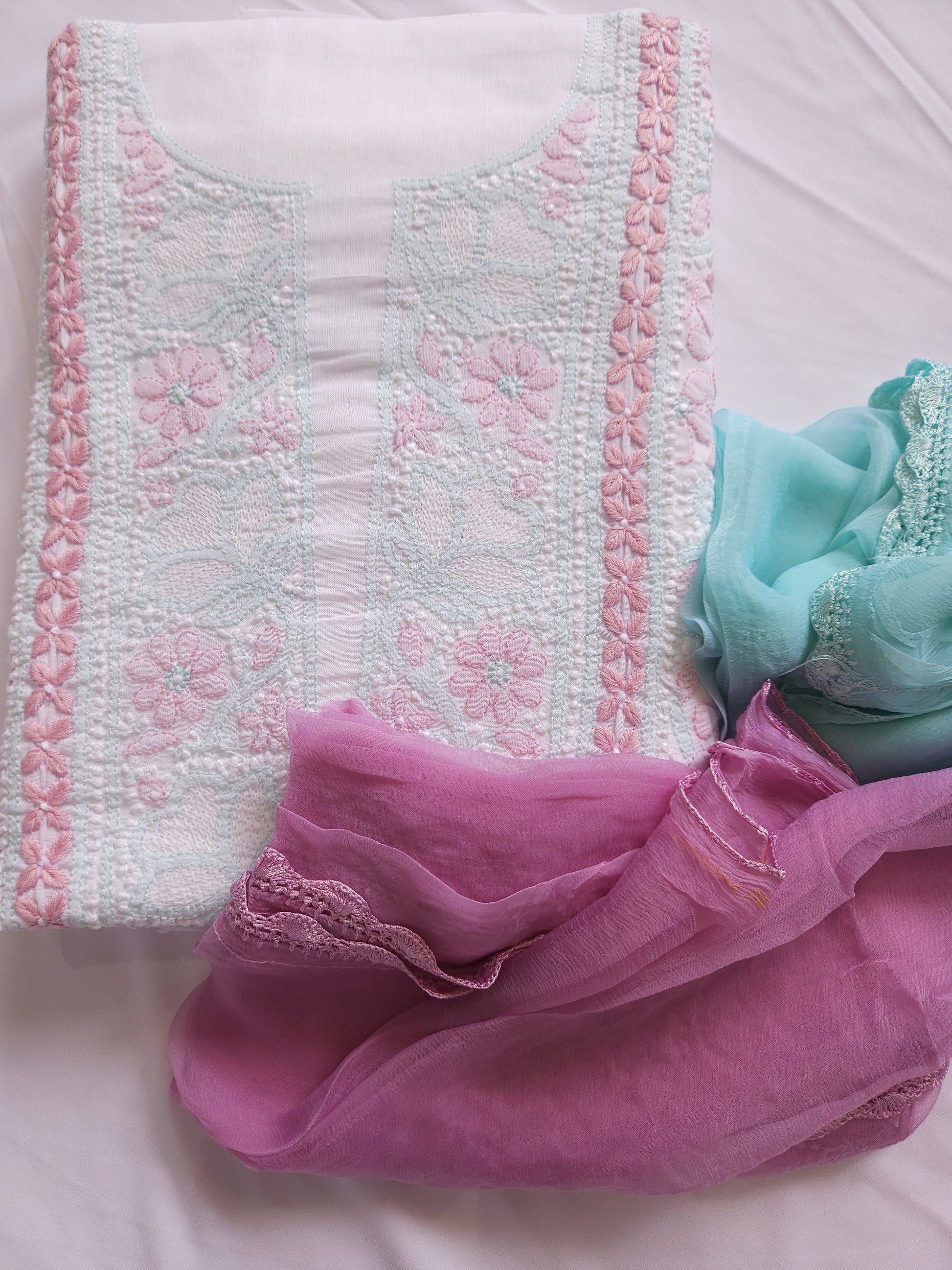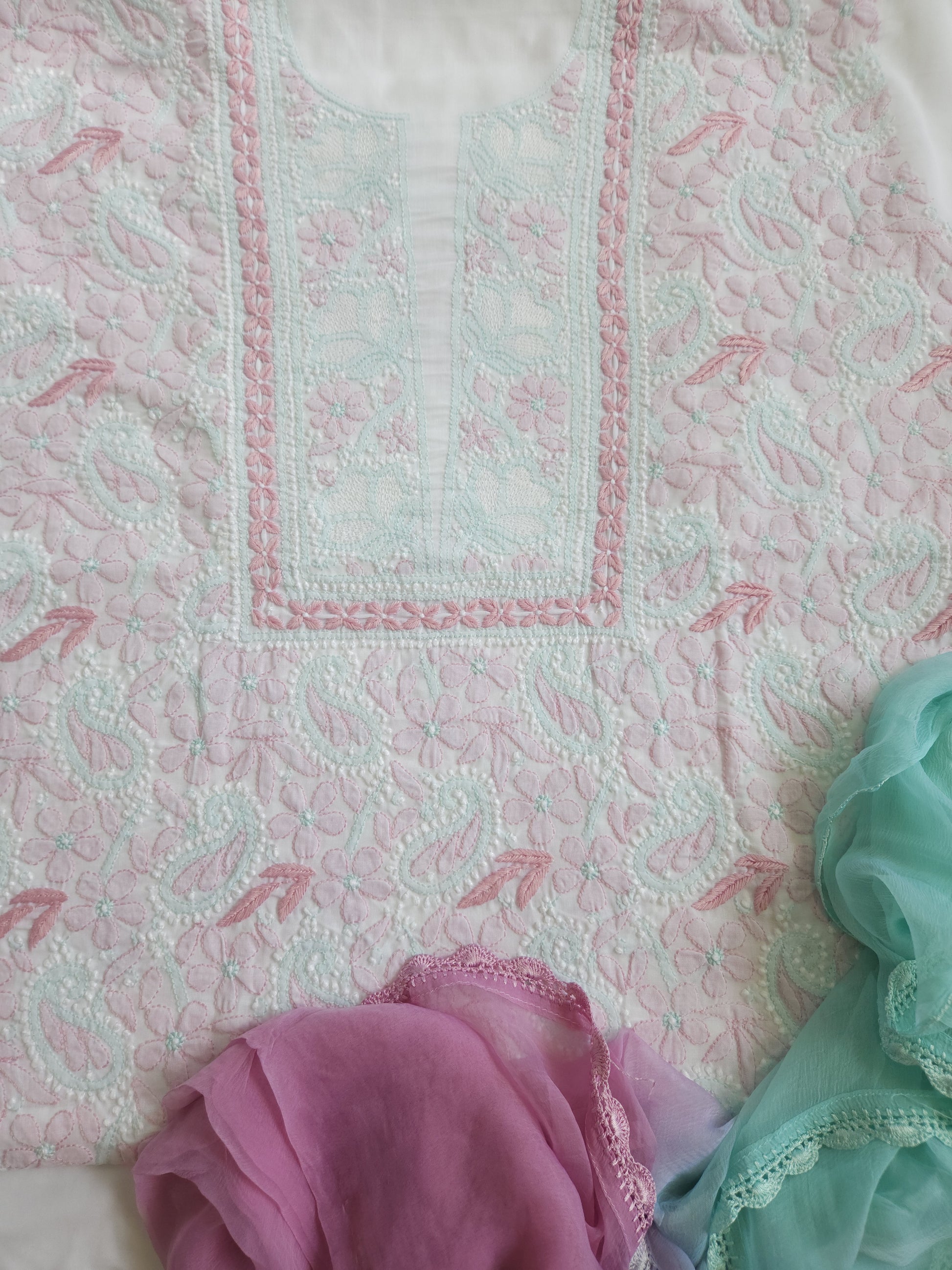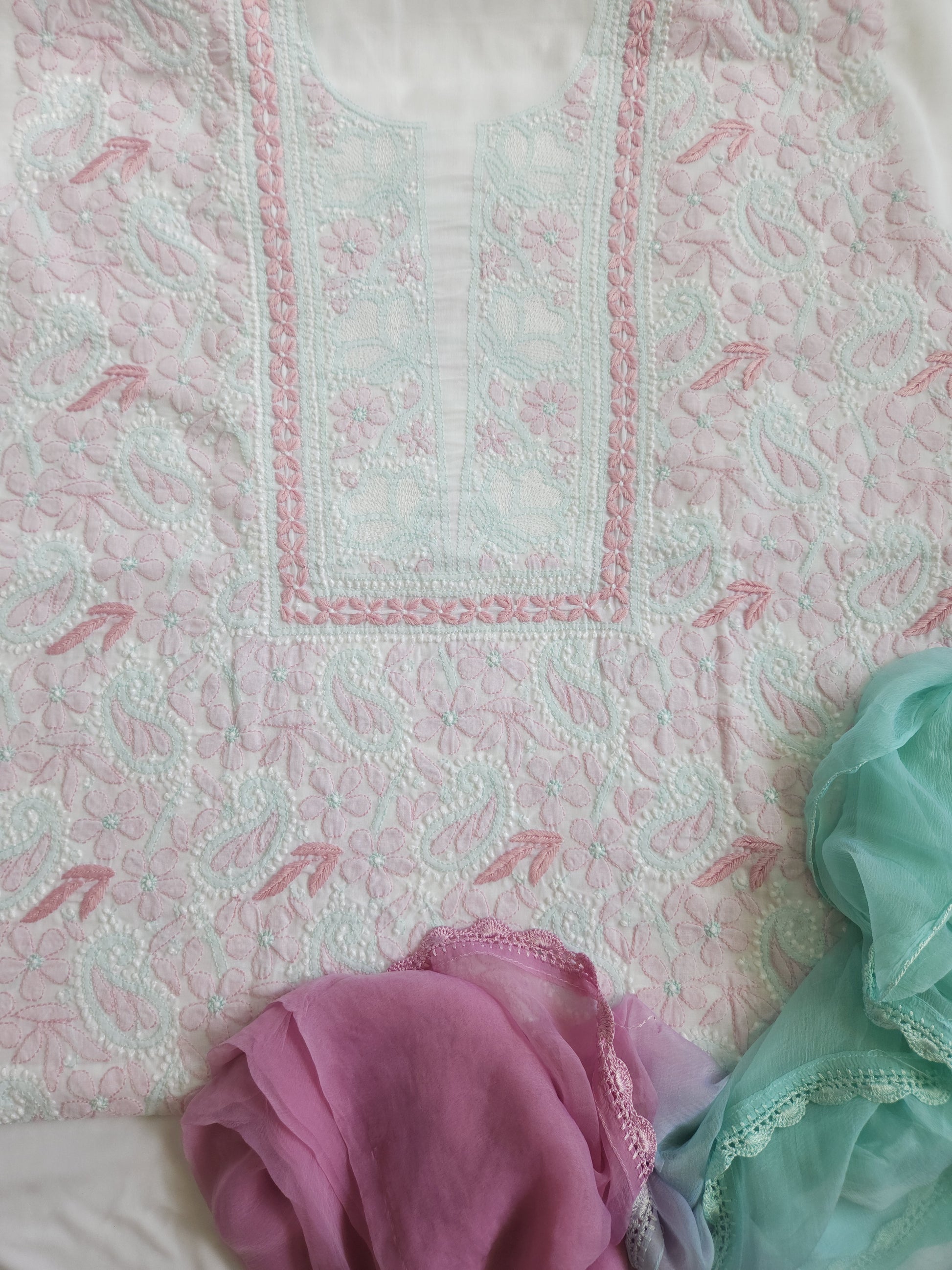 Authentic Lucknowi Handwork Chikankari, Front Full Jaal Kurta with Border Bootie Work on Sleeves, with Border Bootie Salwar and Sleeves, with Chiffon Dupatta.