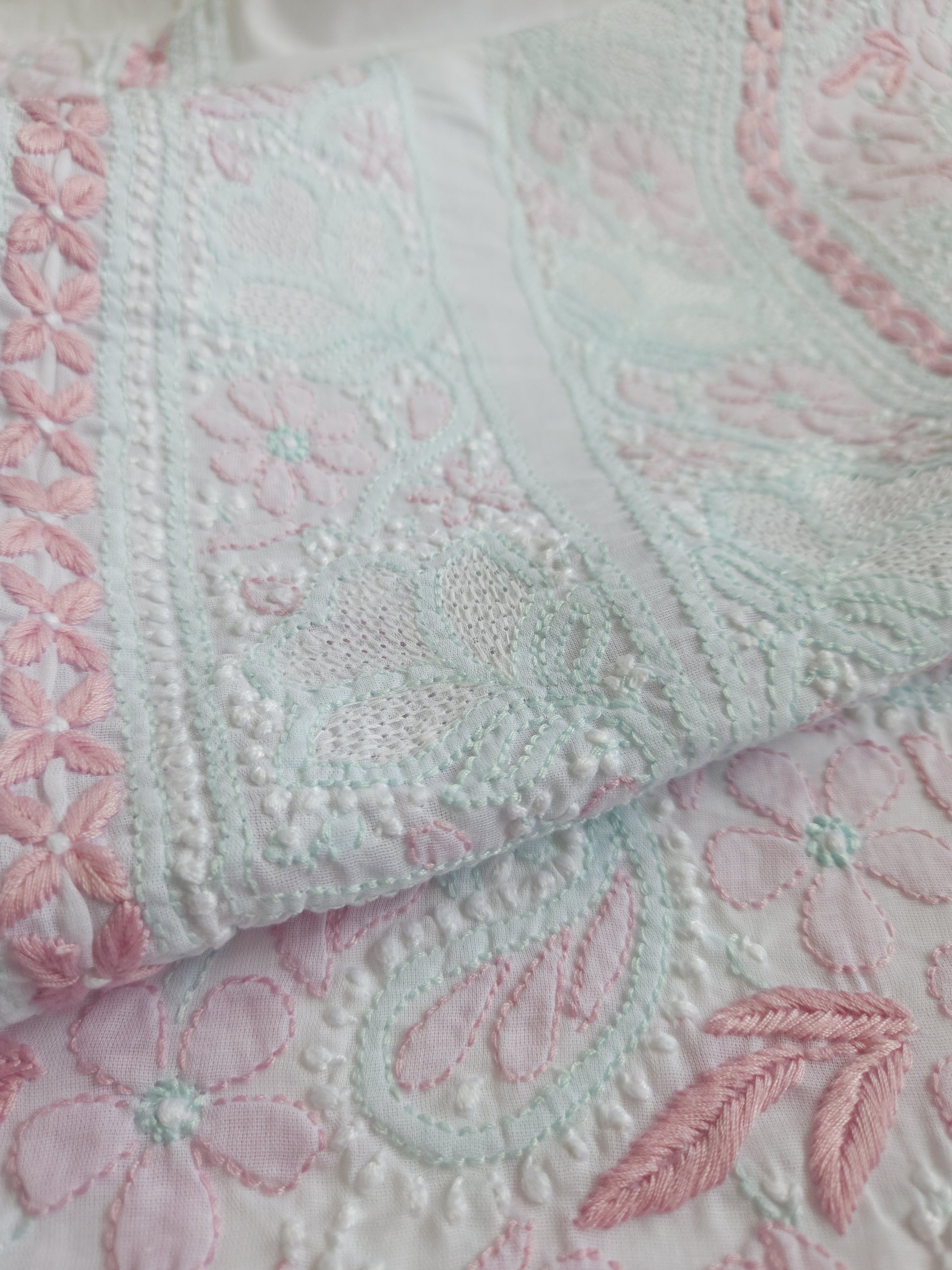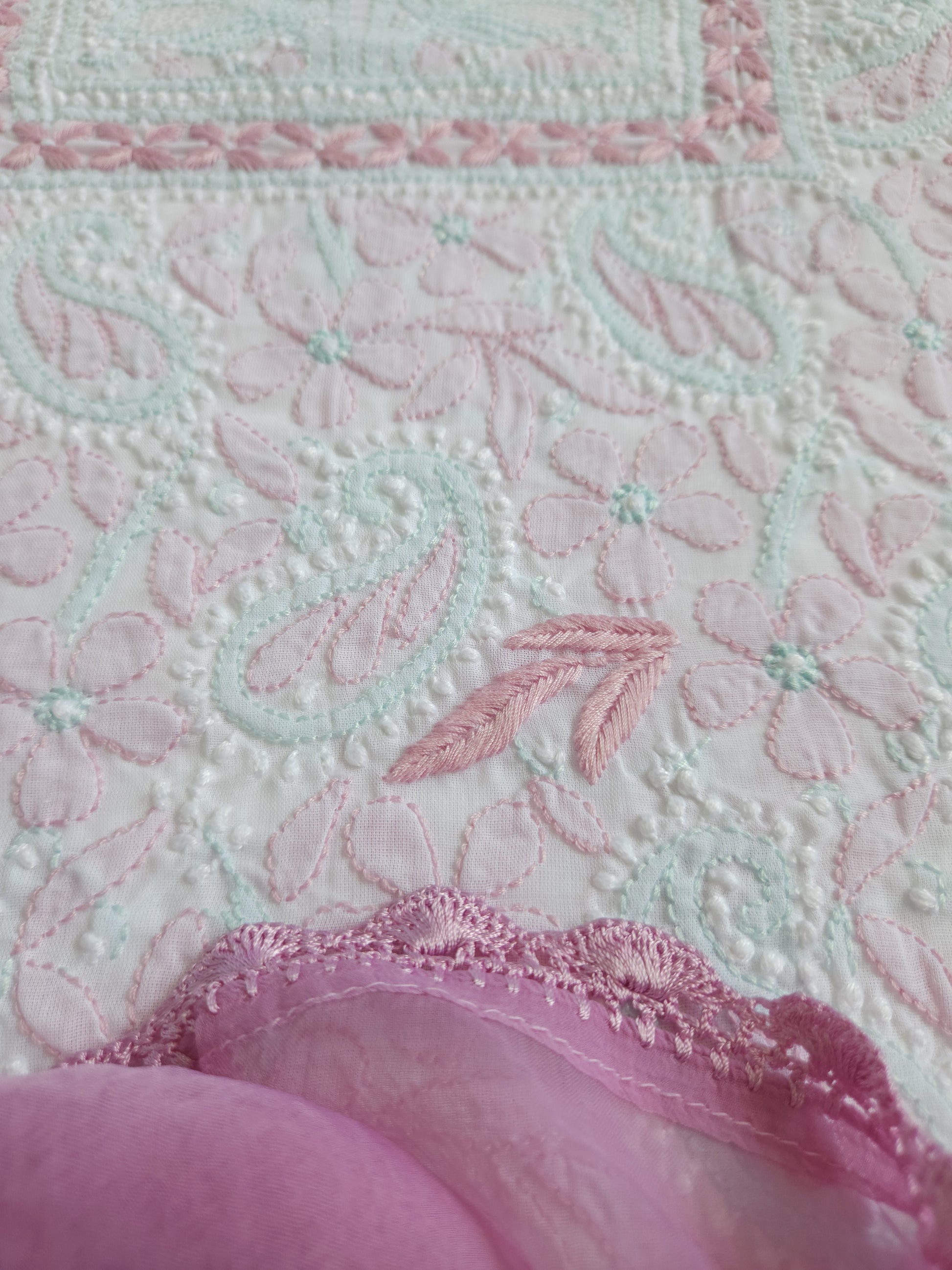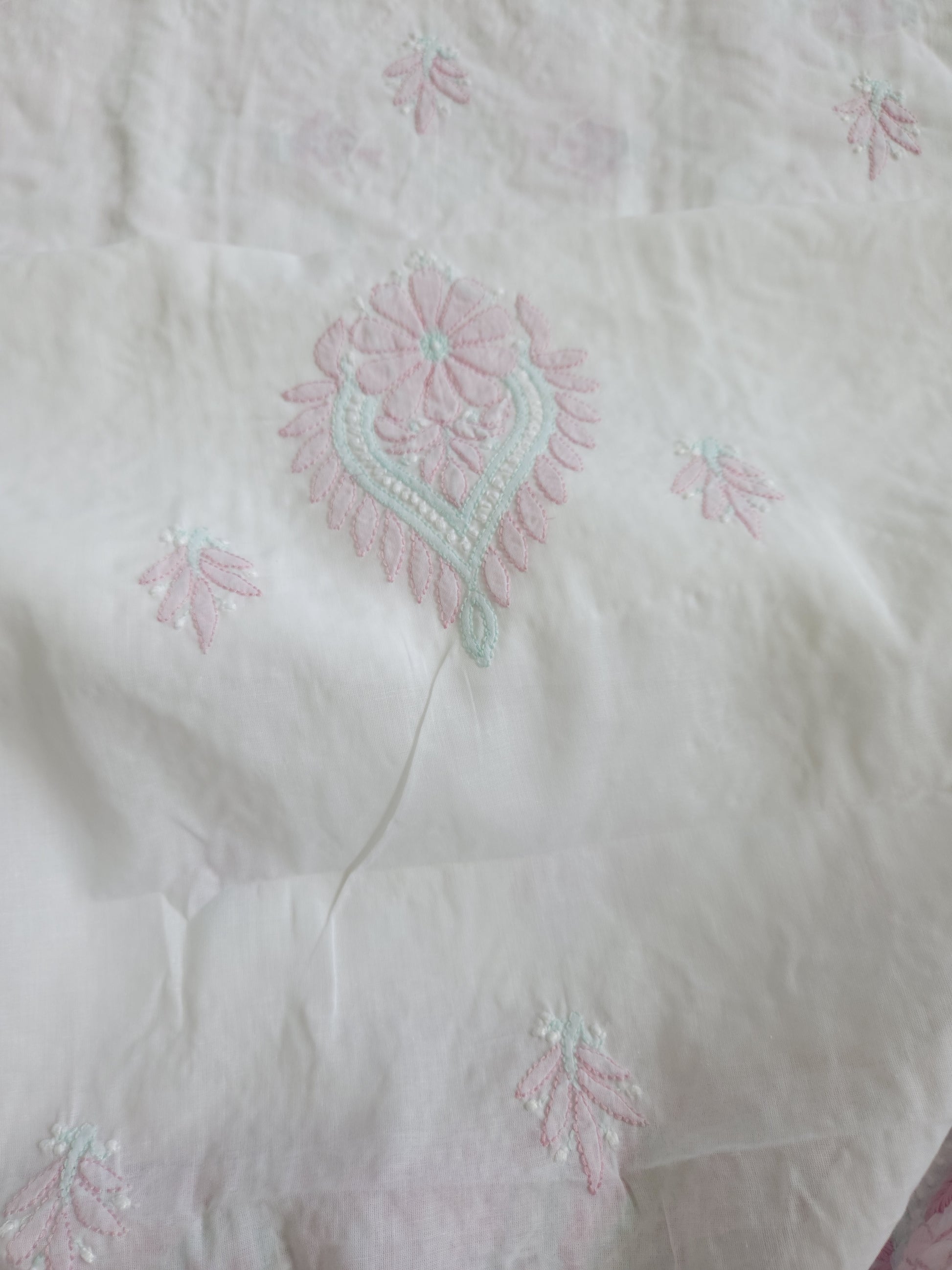 Colour: White Base with Sea Green and Pink coloured thread embroidery.