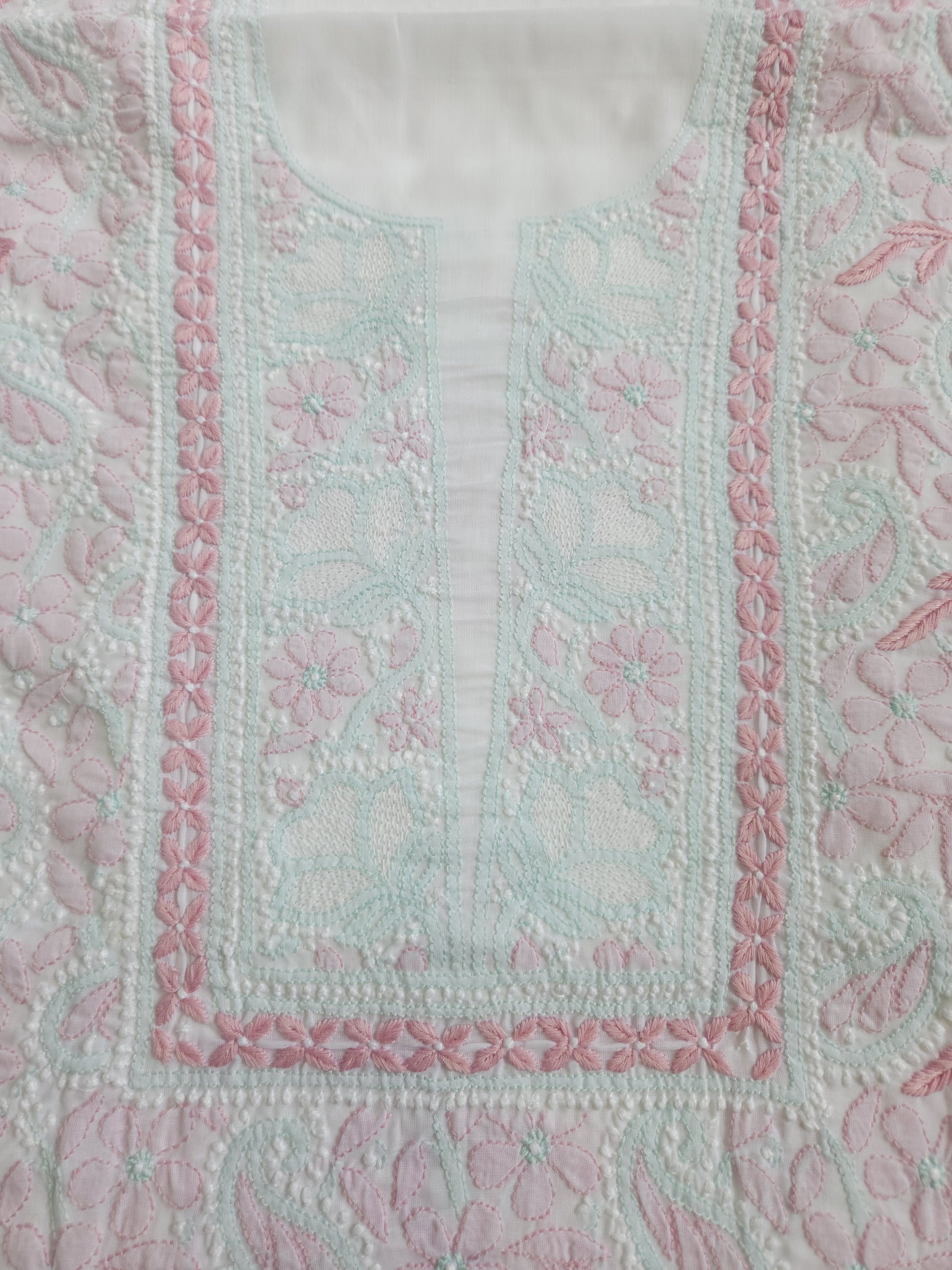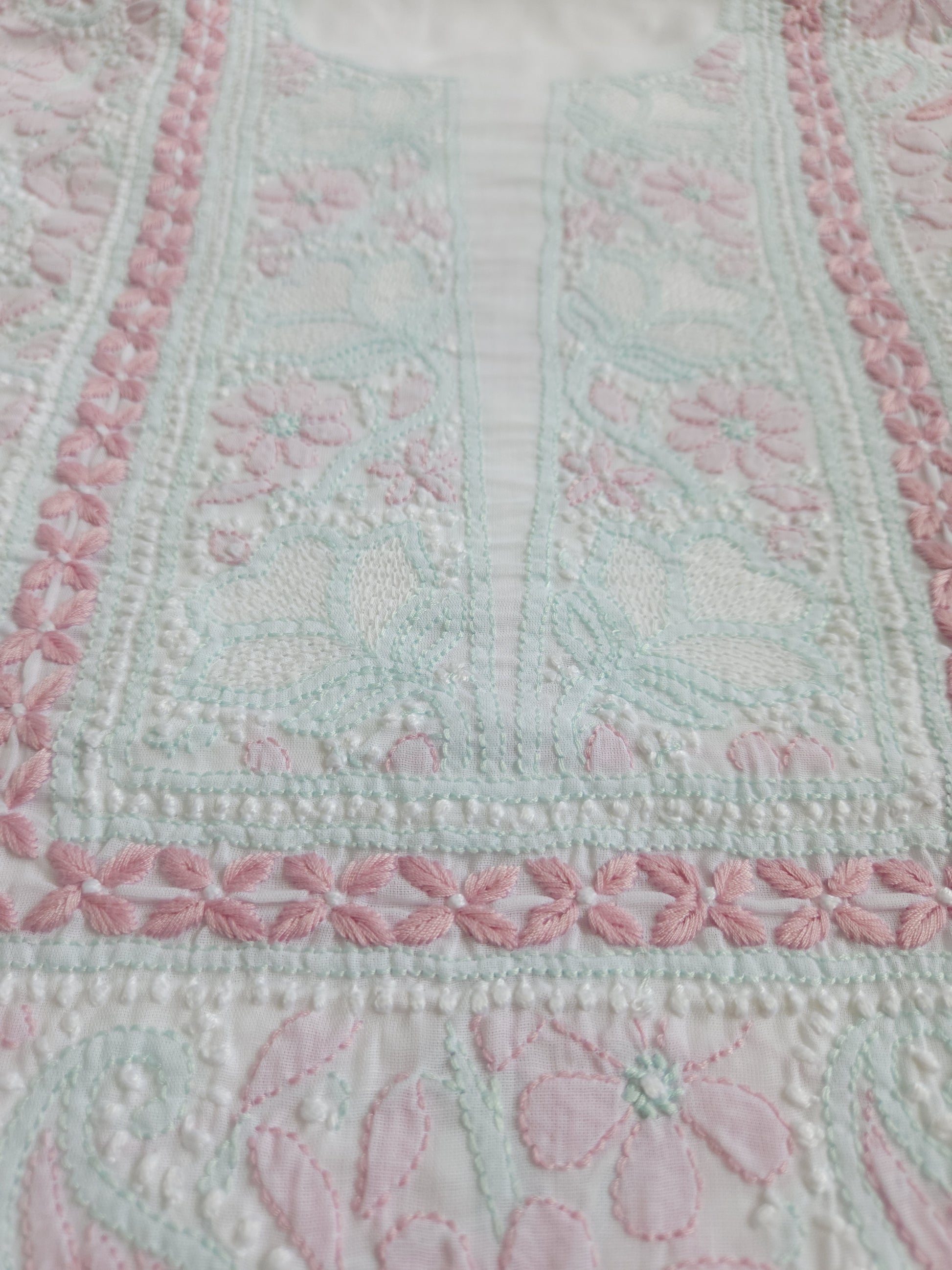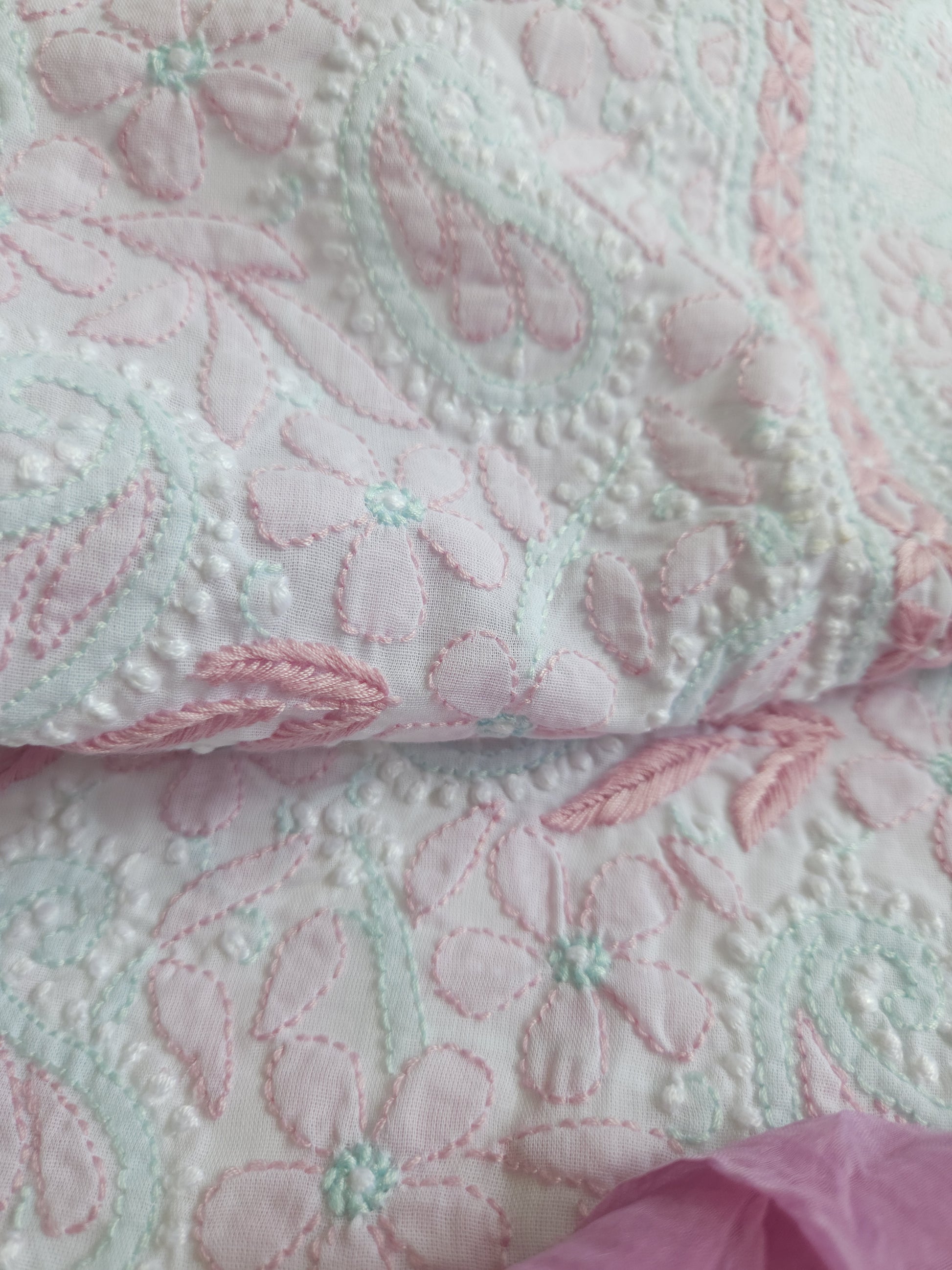 Colour: White Base with Sea Green and Pink coloured thread embroidery.