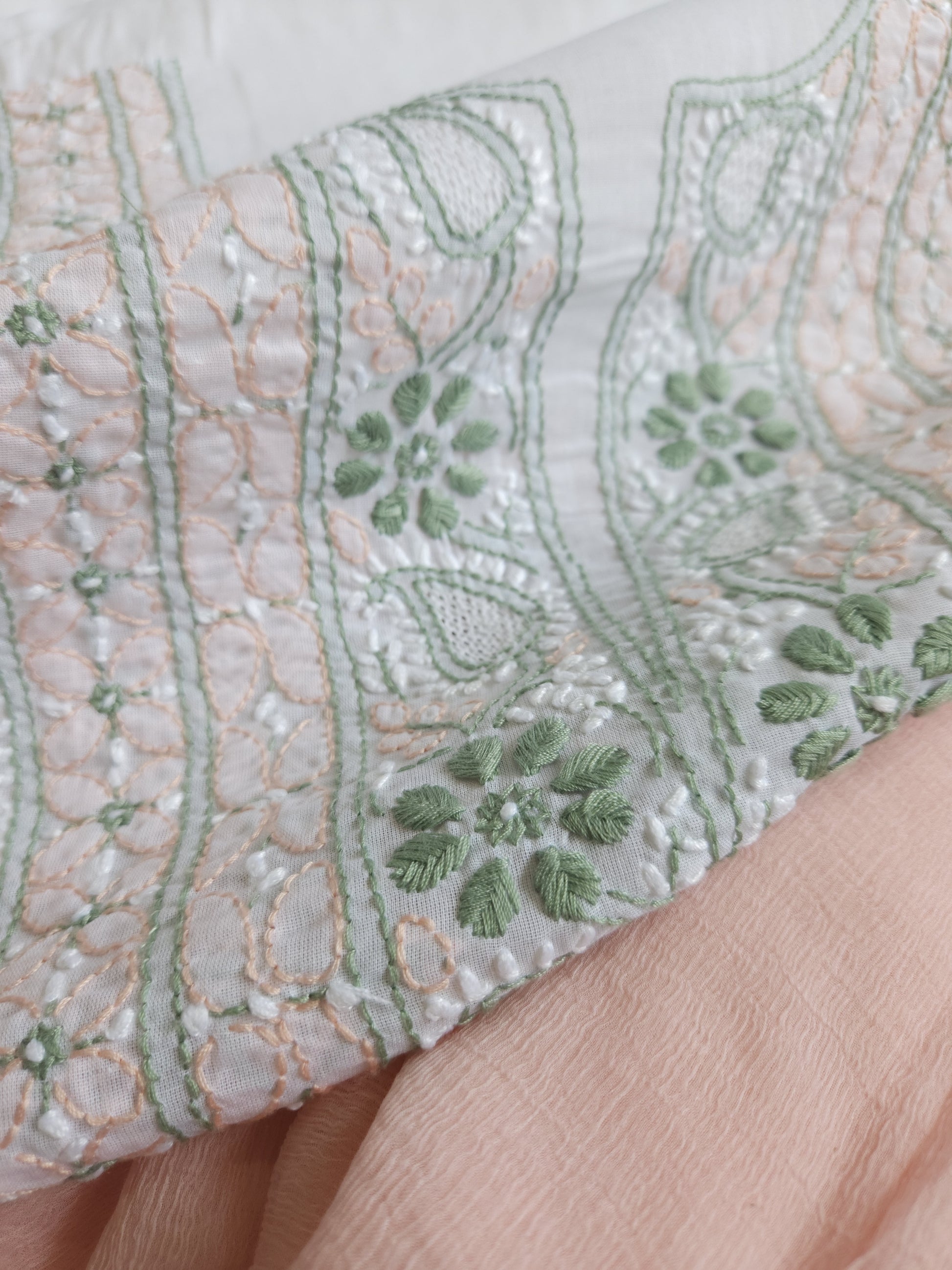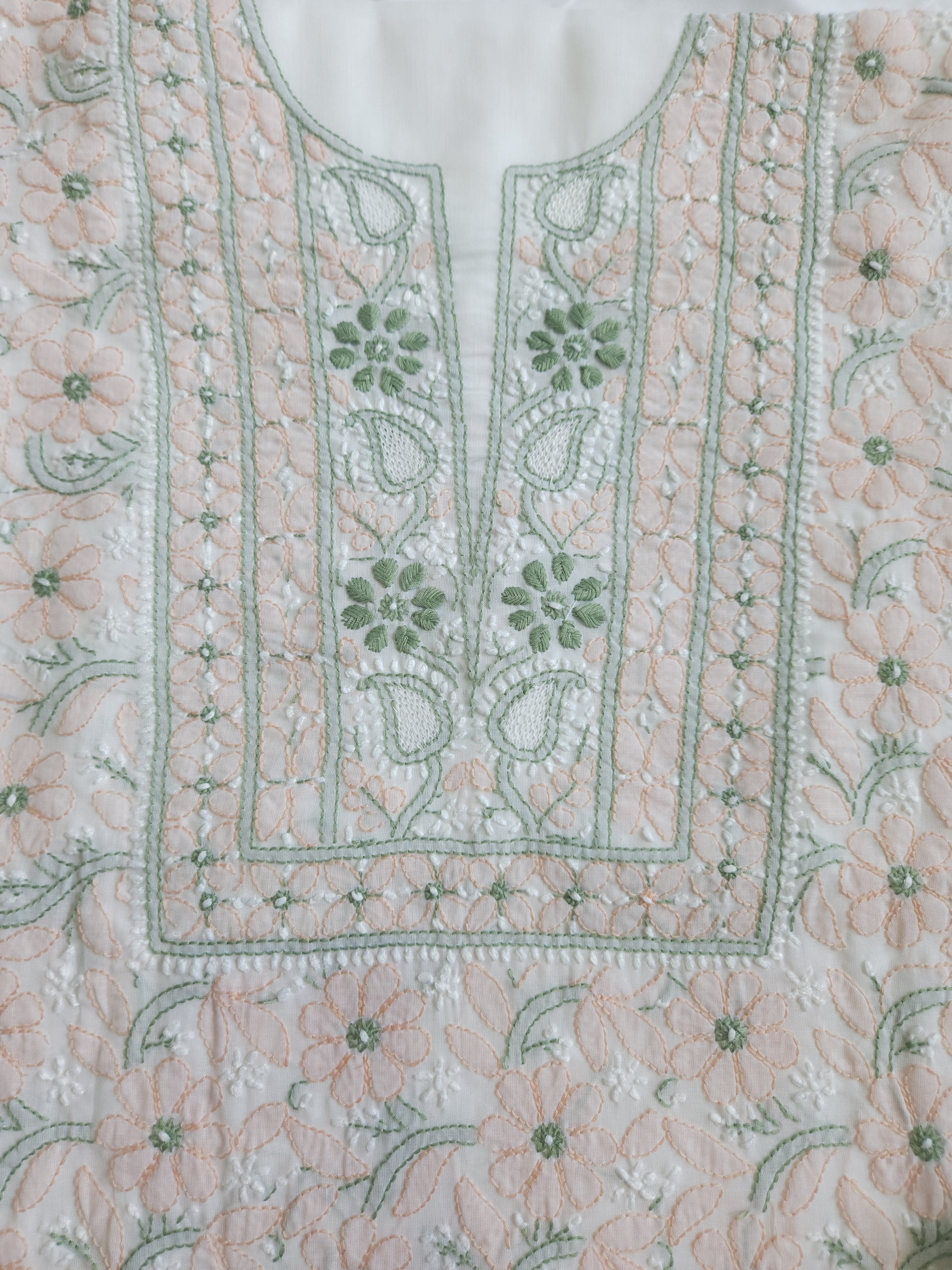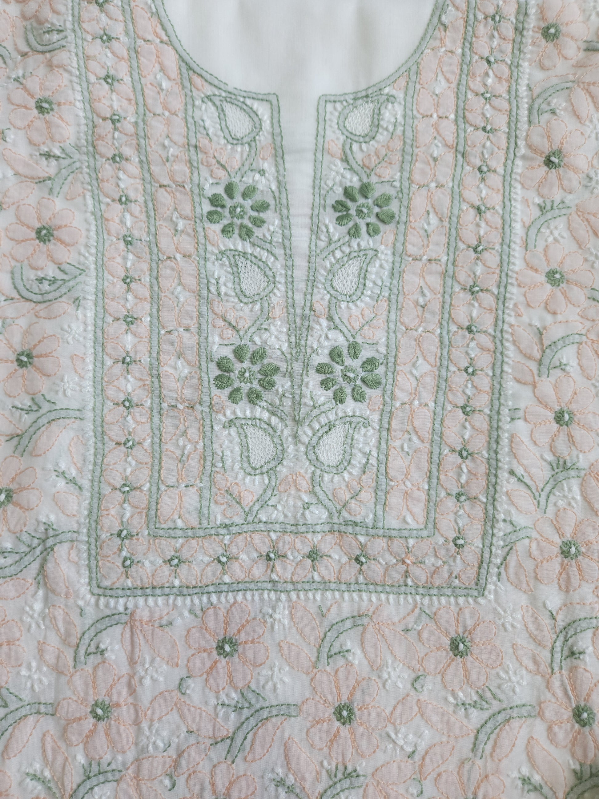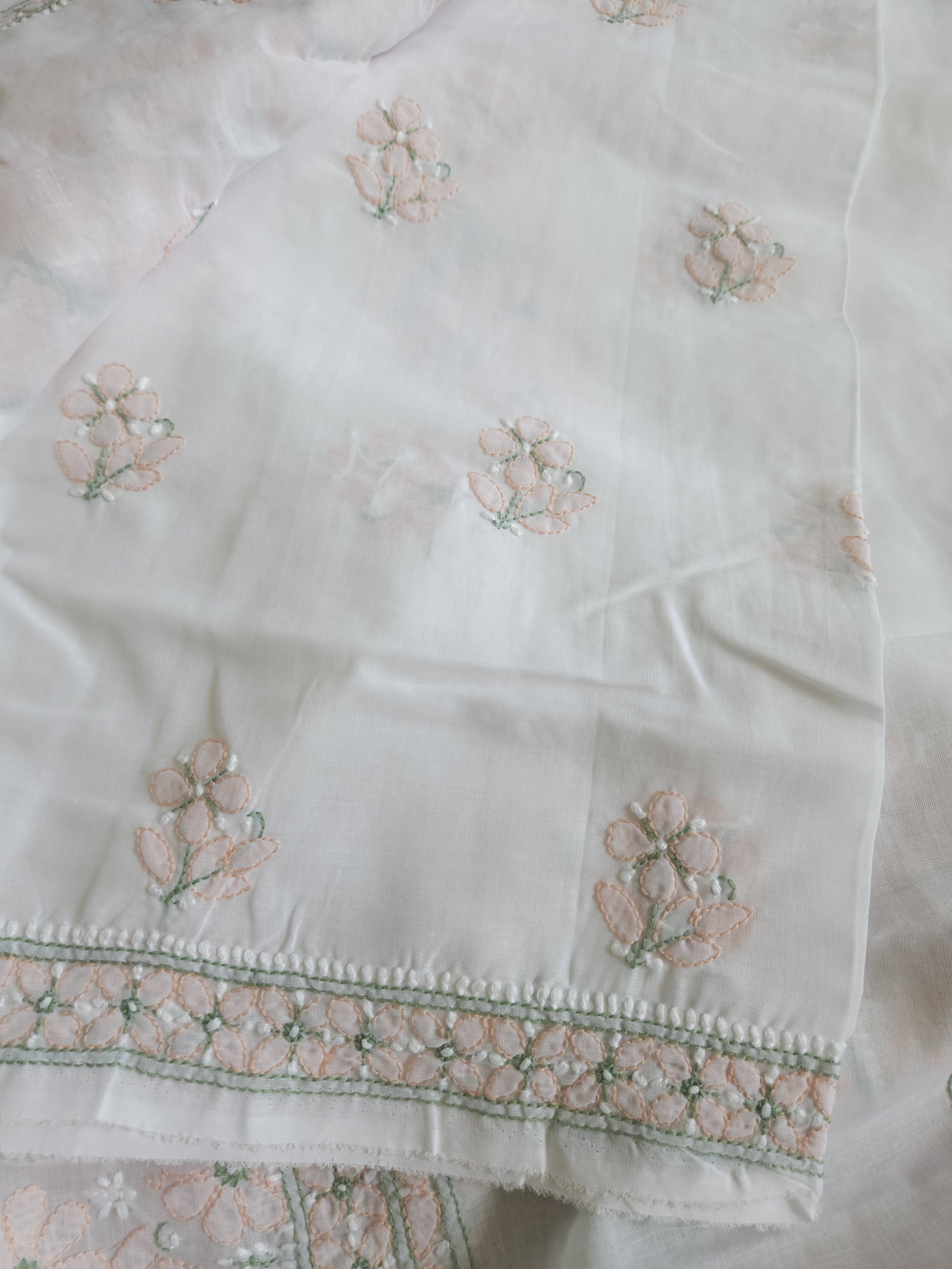 Colour: White Base with Green and Peach coloured thread embroidery.