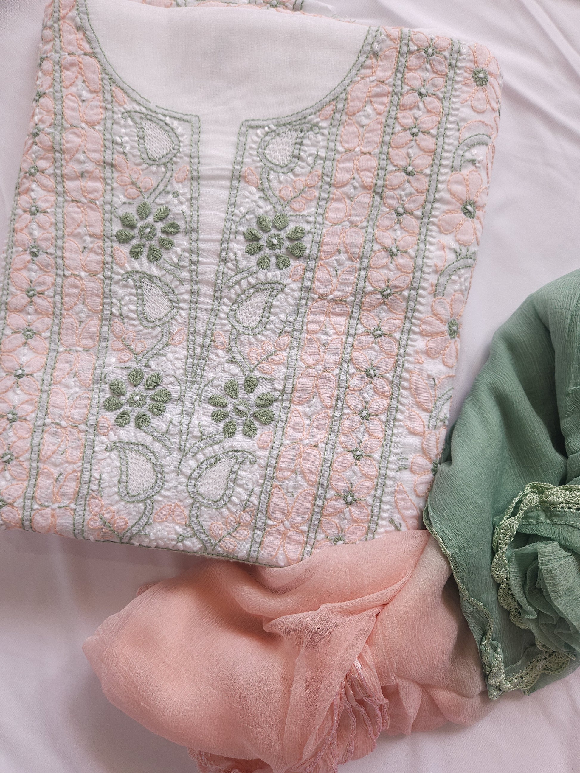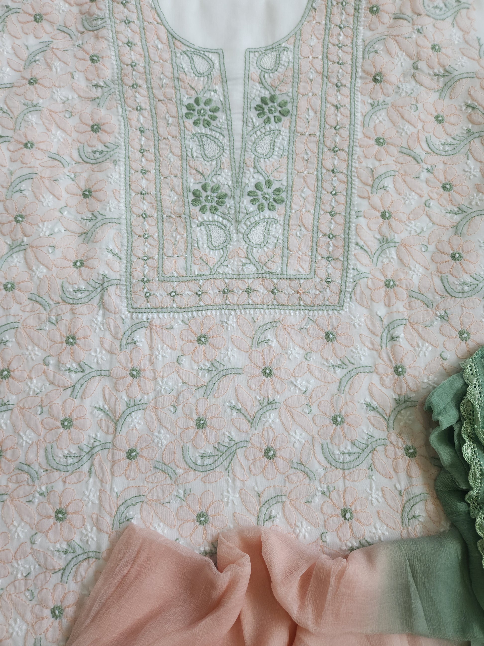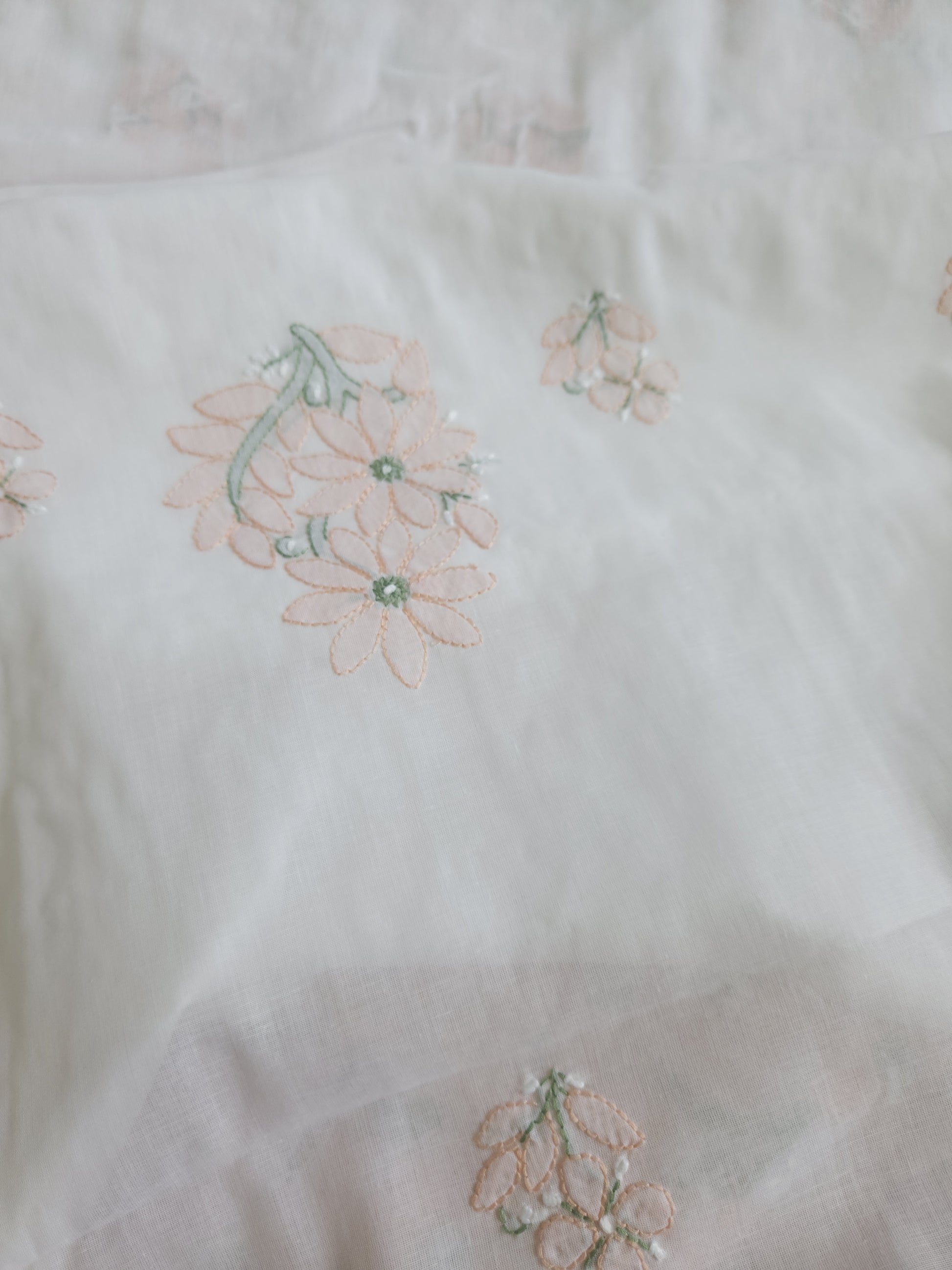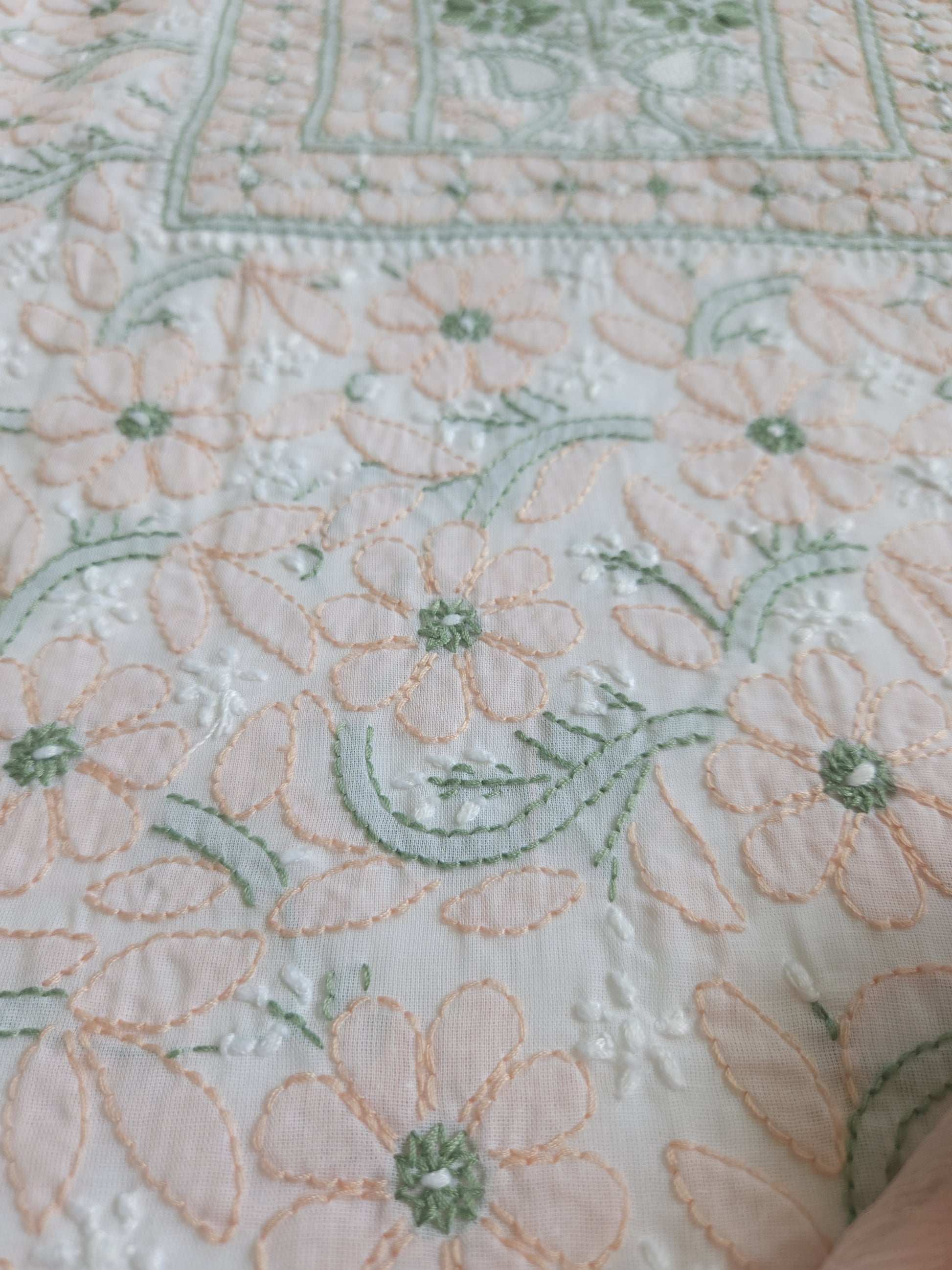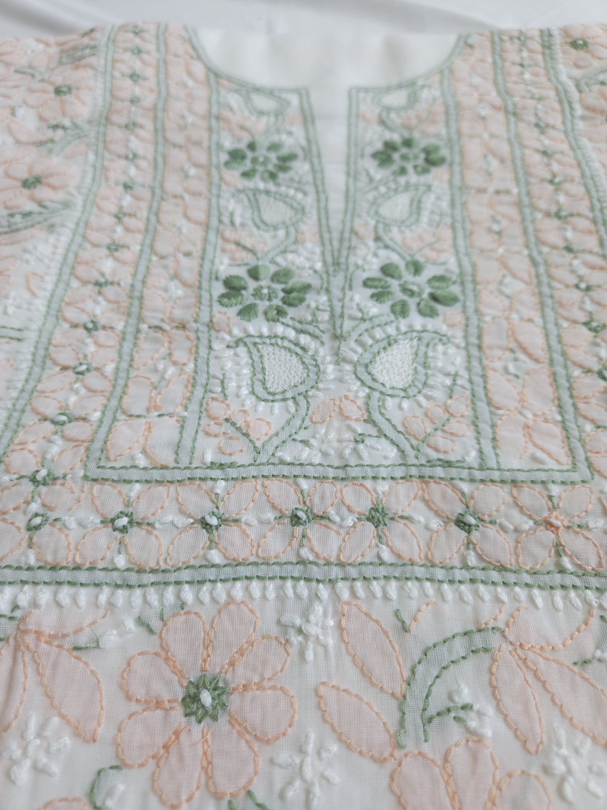 Colour: White Base with Green and Peach coloured thread embroidery.