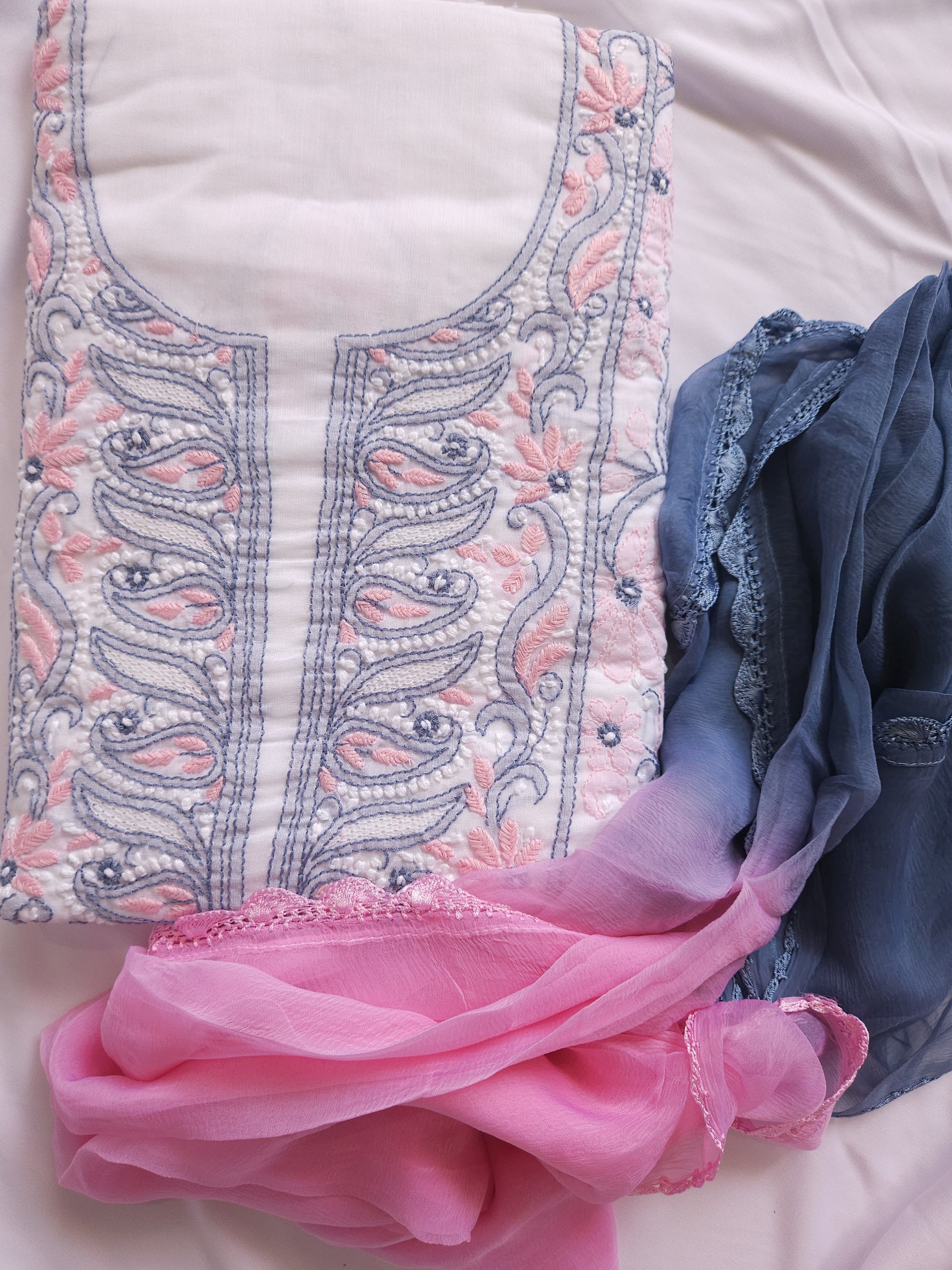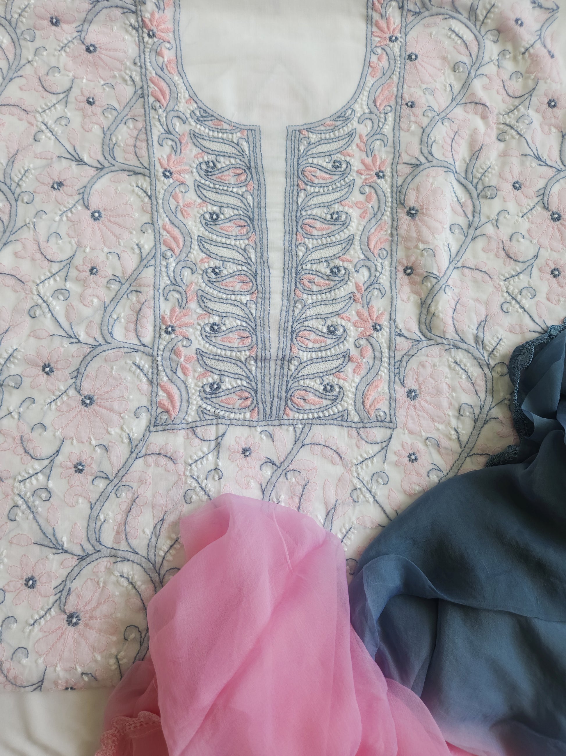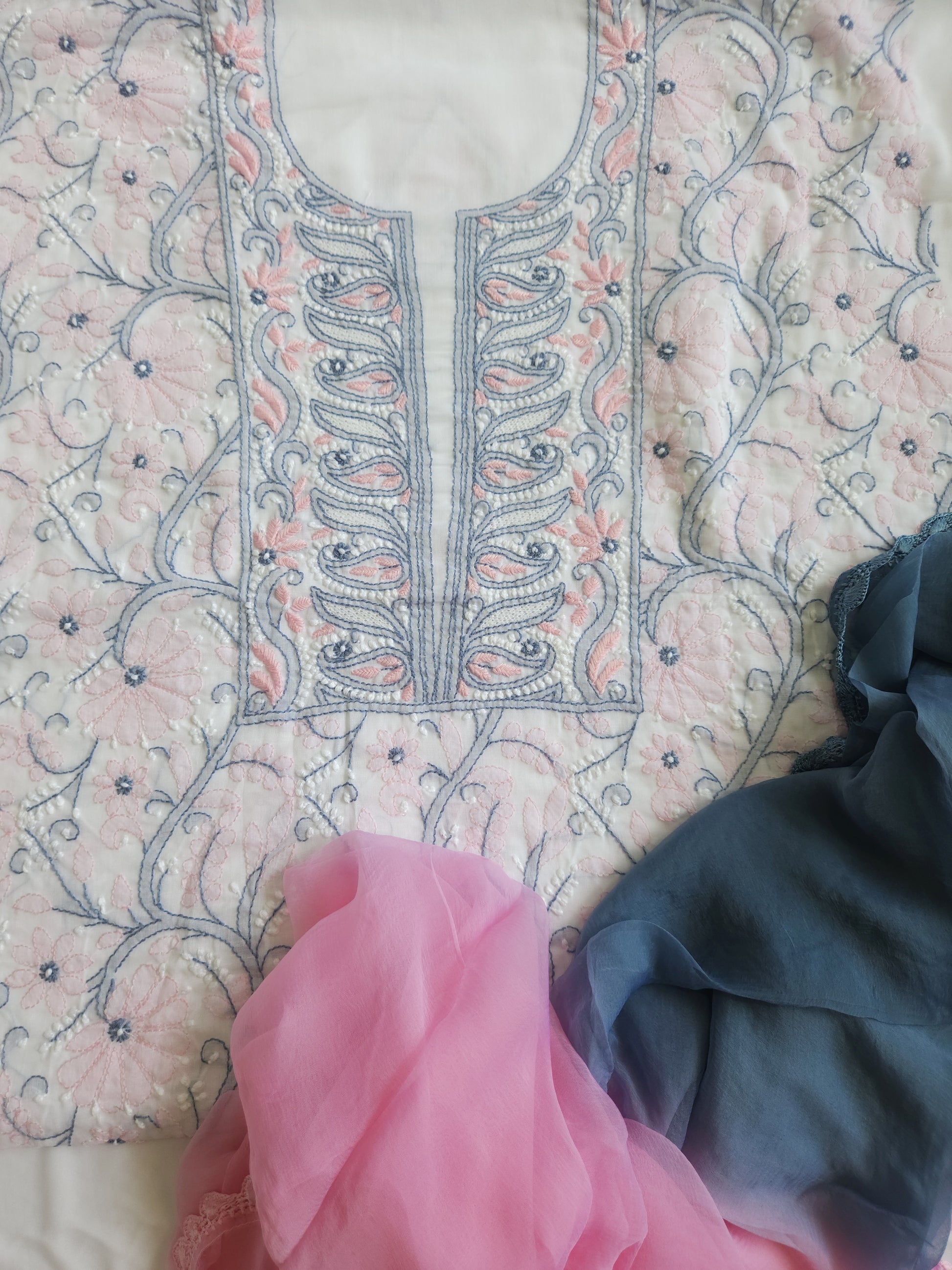 Authentic Lucknowi Handwork Chikankari, Front Full Jaal Kurta with Border Bootie Work on Sleeves, with Border Bootie Salwar and Sleeves, with Chiffon Dupatta.