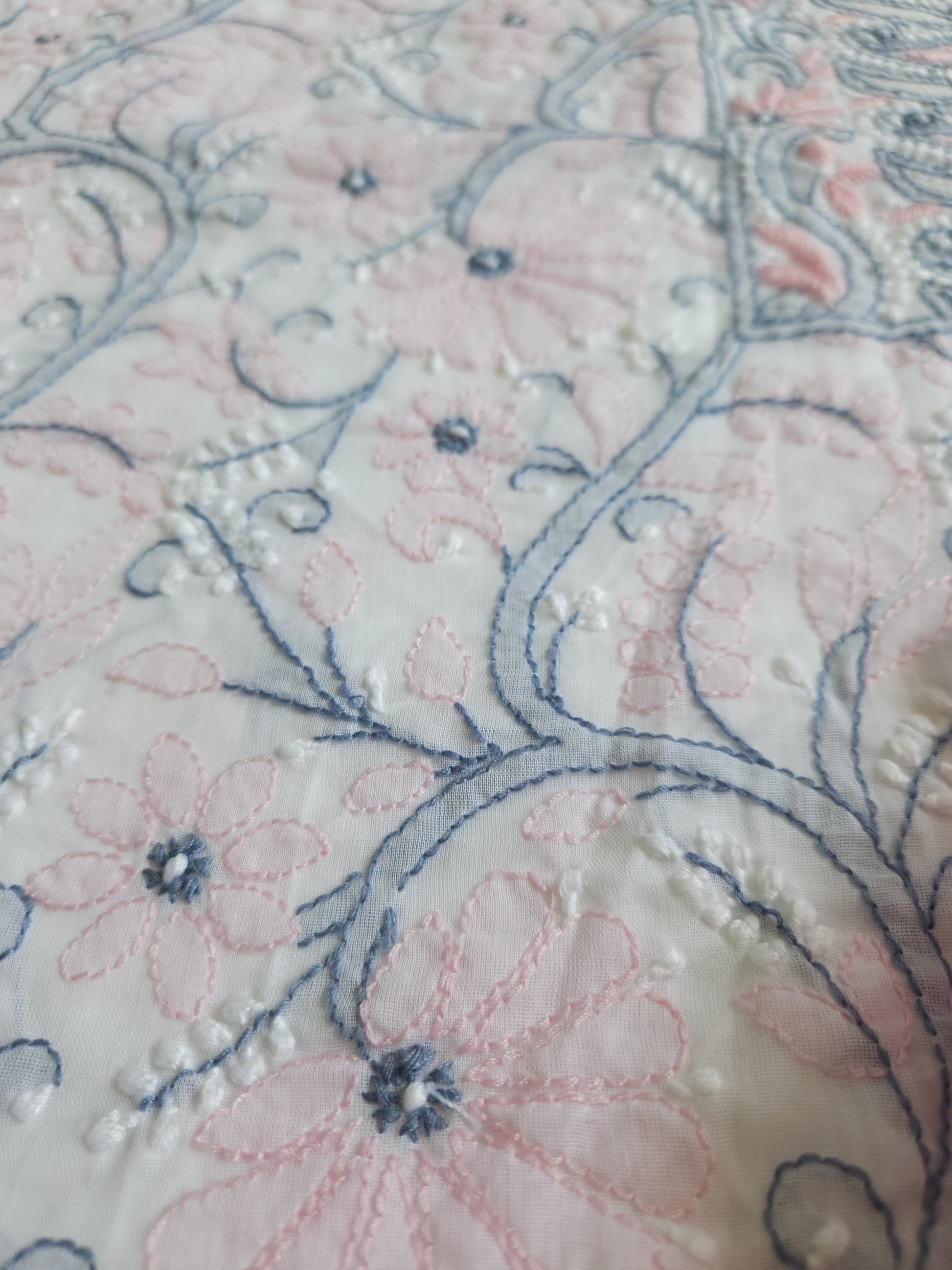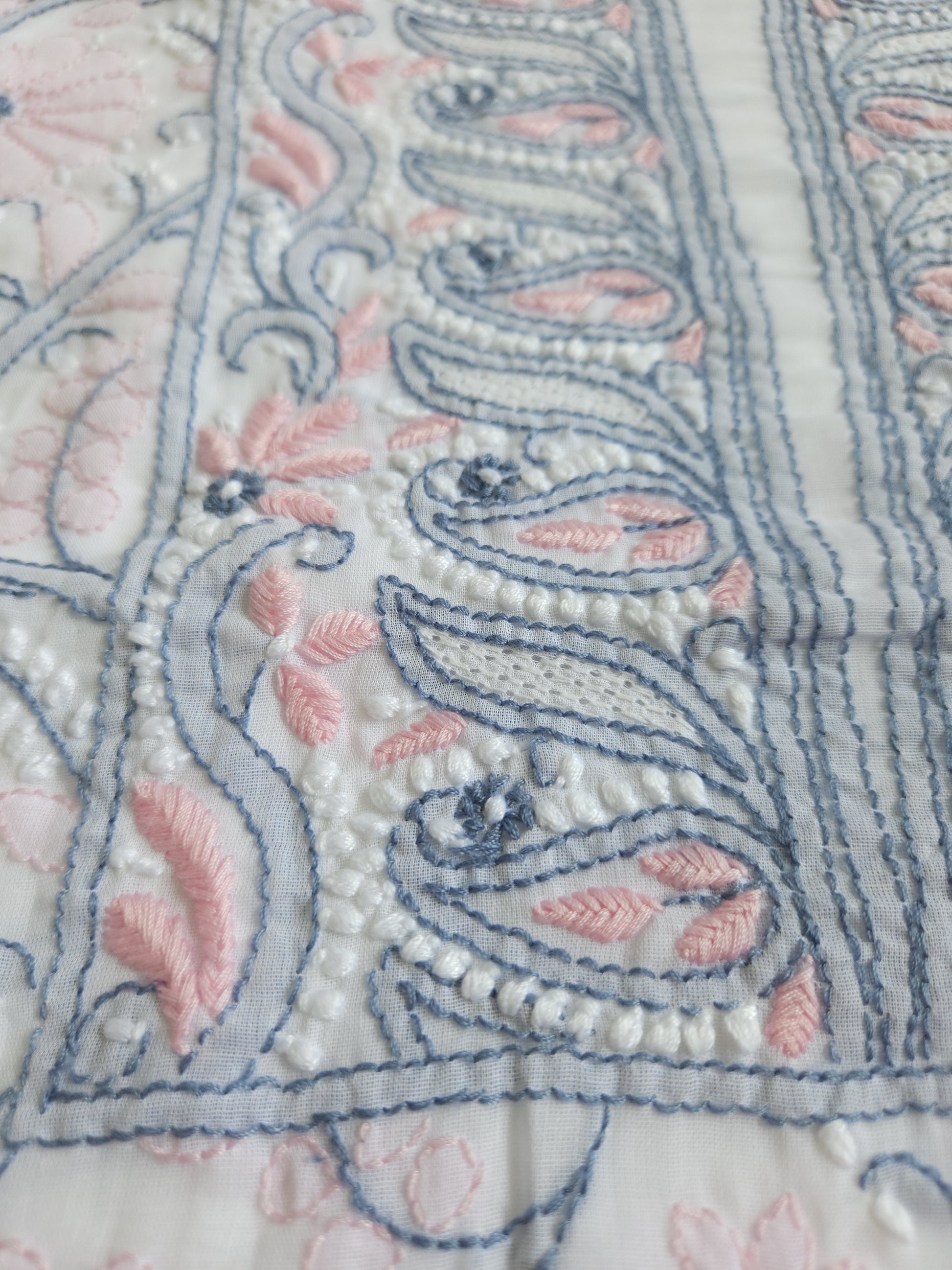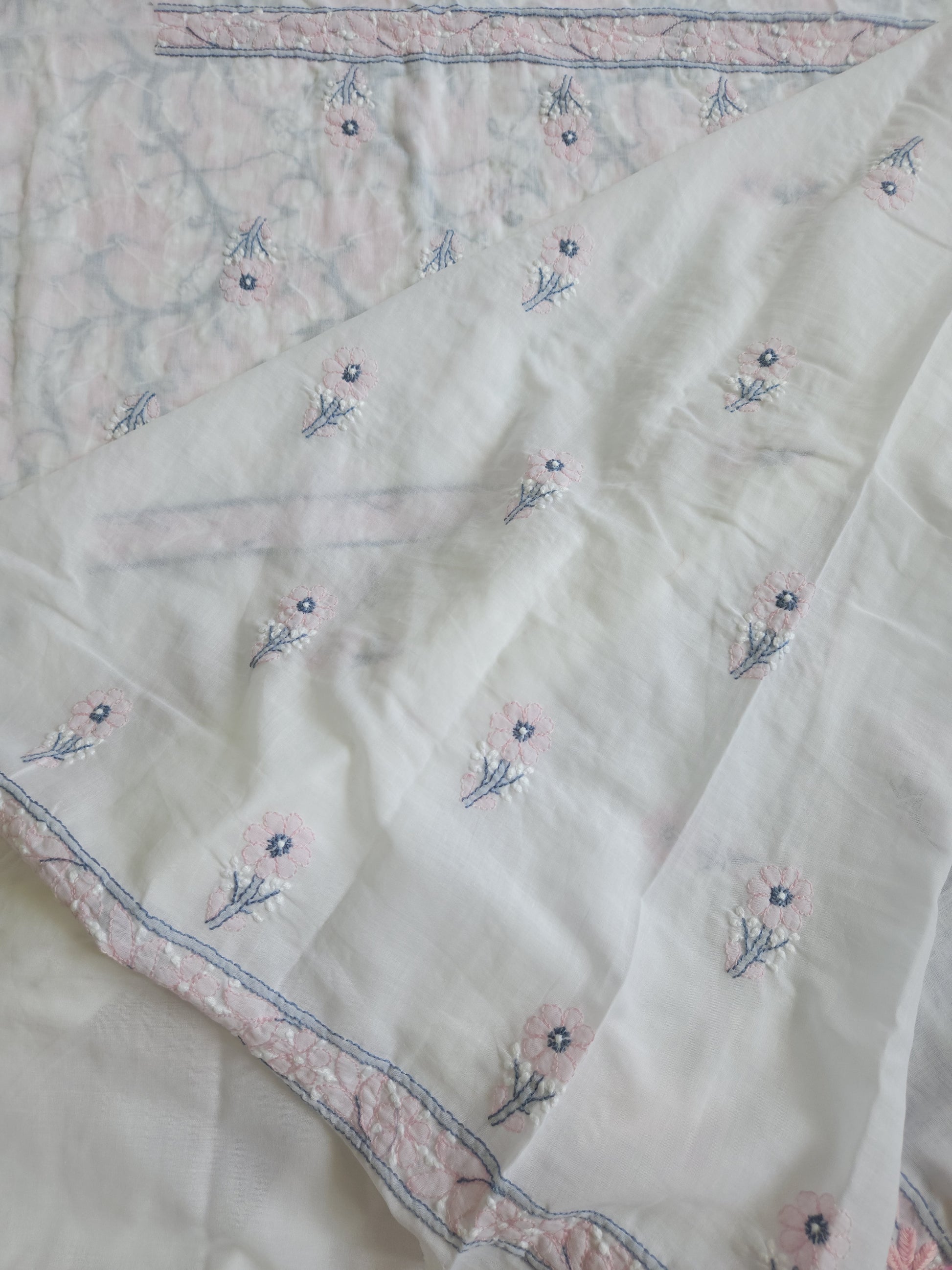 Colour: White Base with Gray and Pink coloured thread embroidery.