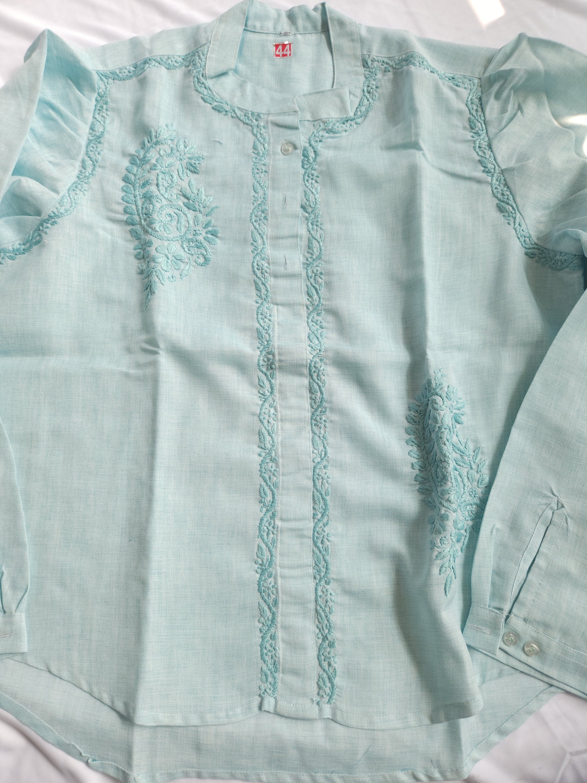 Authentic Luckhnowi Handwork Chikankari Stitched Shirt in Linen Fabric.
