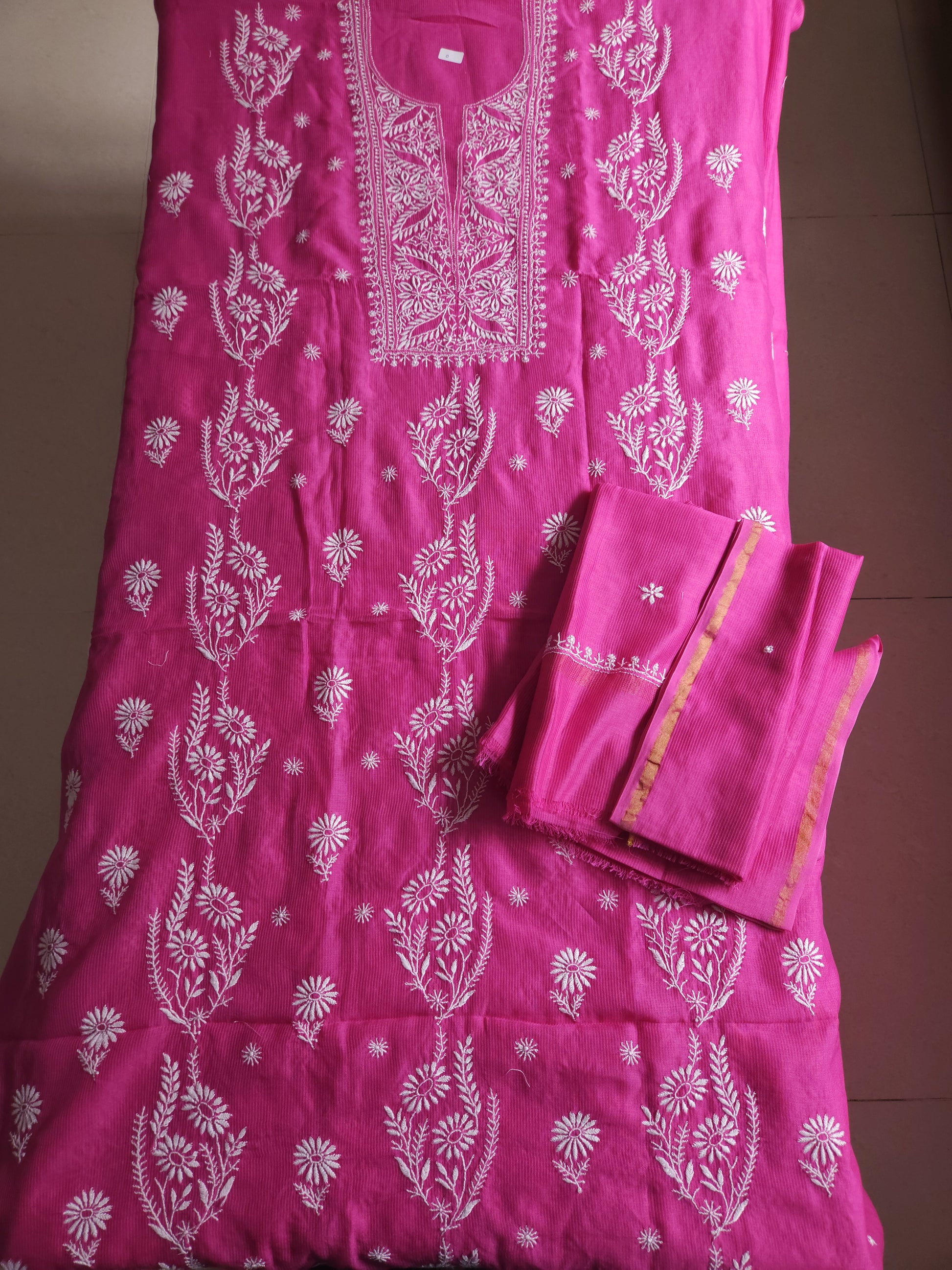 Authentic Lucknowi Handwork Chikankari, Full Front Panel Jaal Kurta; with Heavy Bel Border Bootie Work on Sleeves; with Maheshwari Chanderi 2-Side Border Bootie Dupatta.