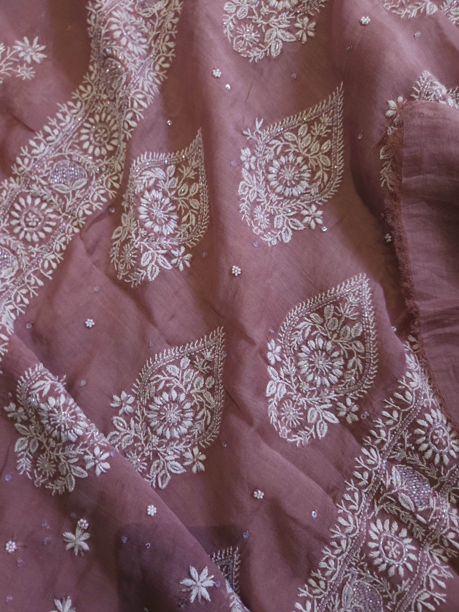 Authentic Luckhnowi Handwork Chikankari; with four side border booties Dupatta along with embellishmenst of katdana and sequin