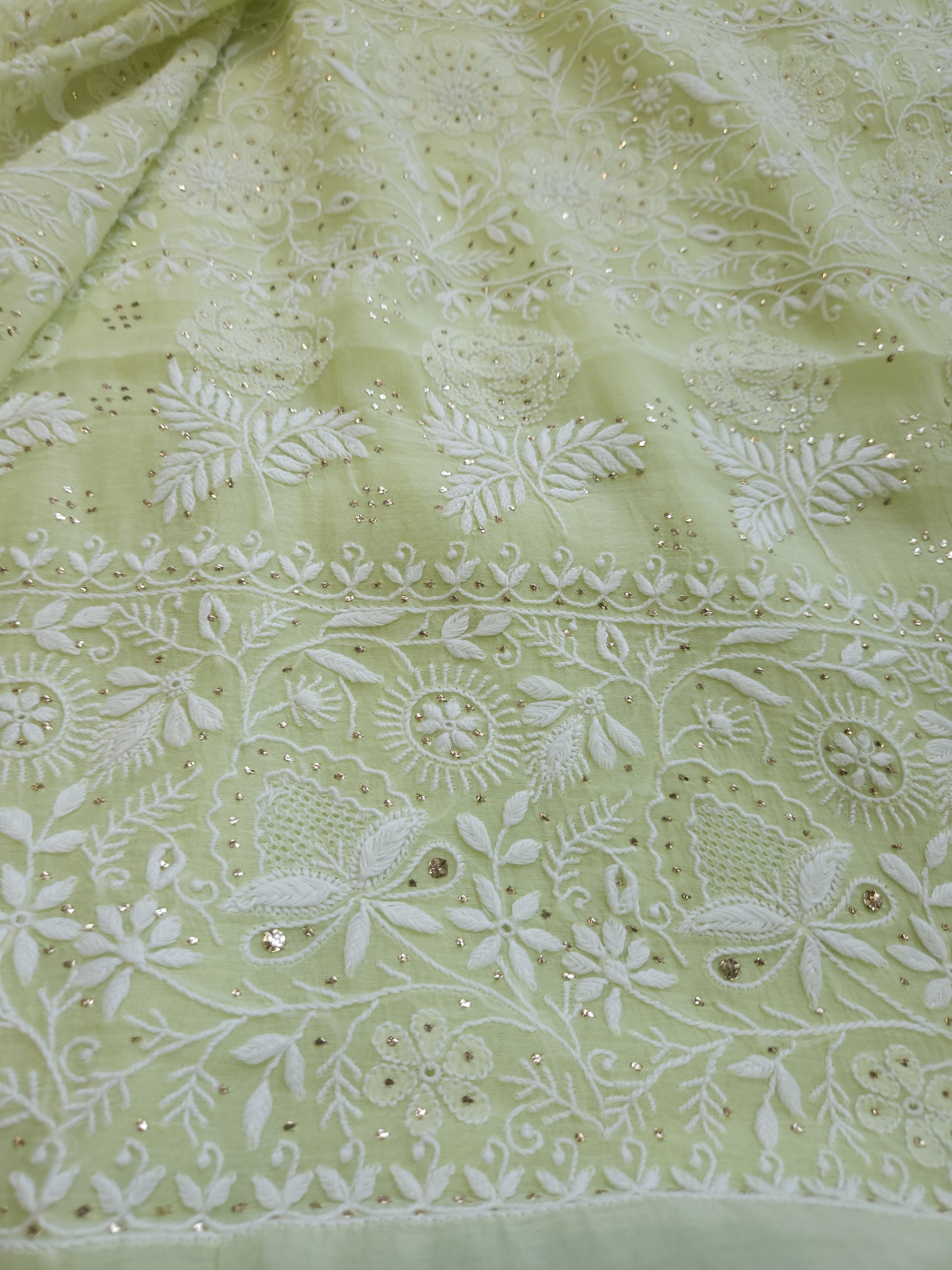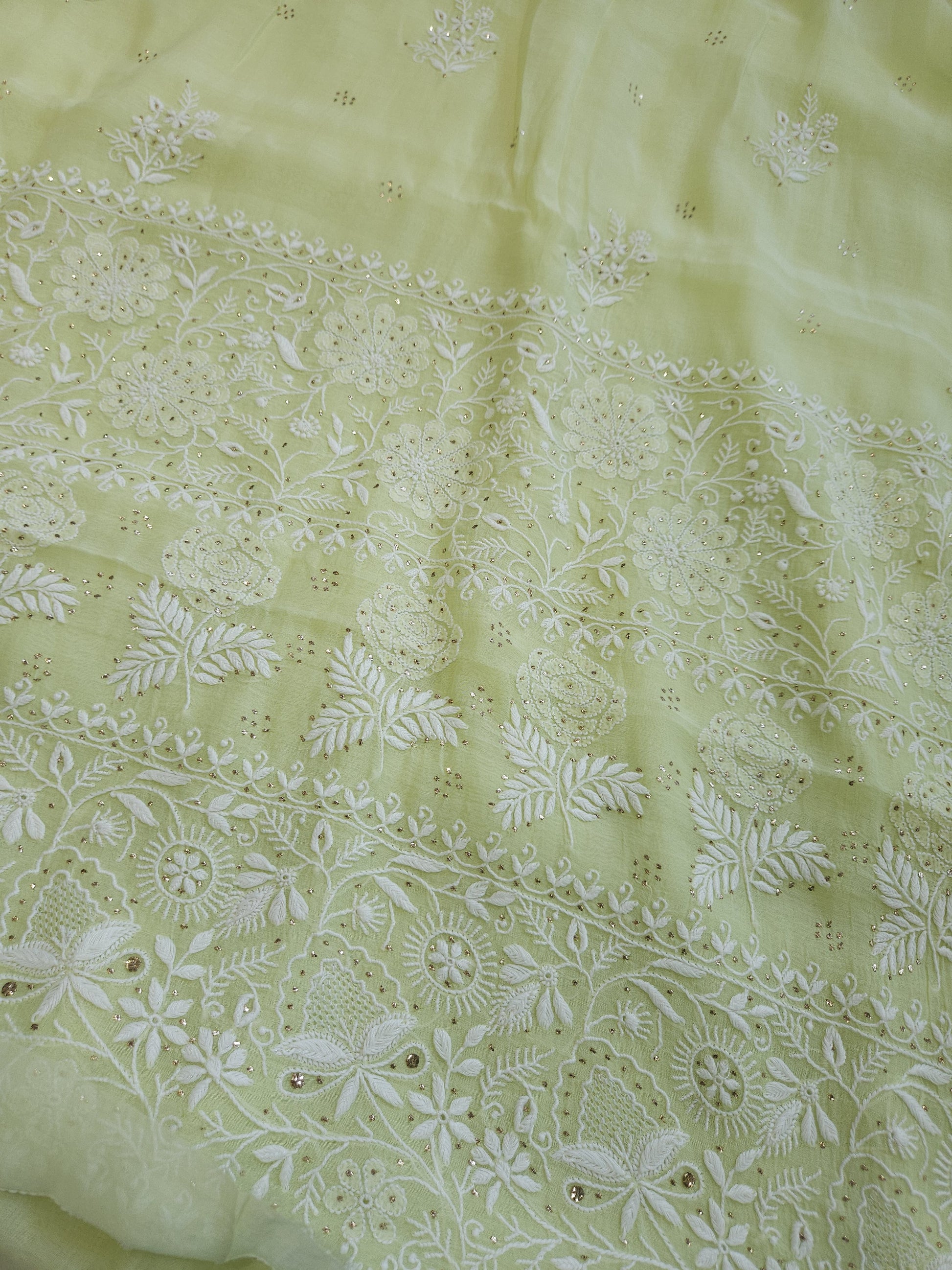 Authentic Luckhnowi Handwork Chikankari Saree; with Heavy Border Work on Pallu and Bootie All Over; with Kaamdani Baadla Work; with Blouse Fabric.