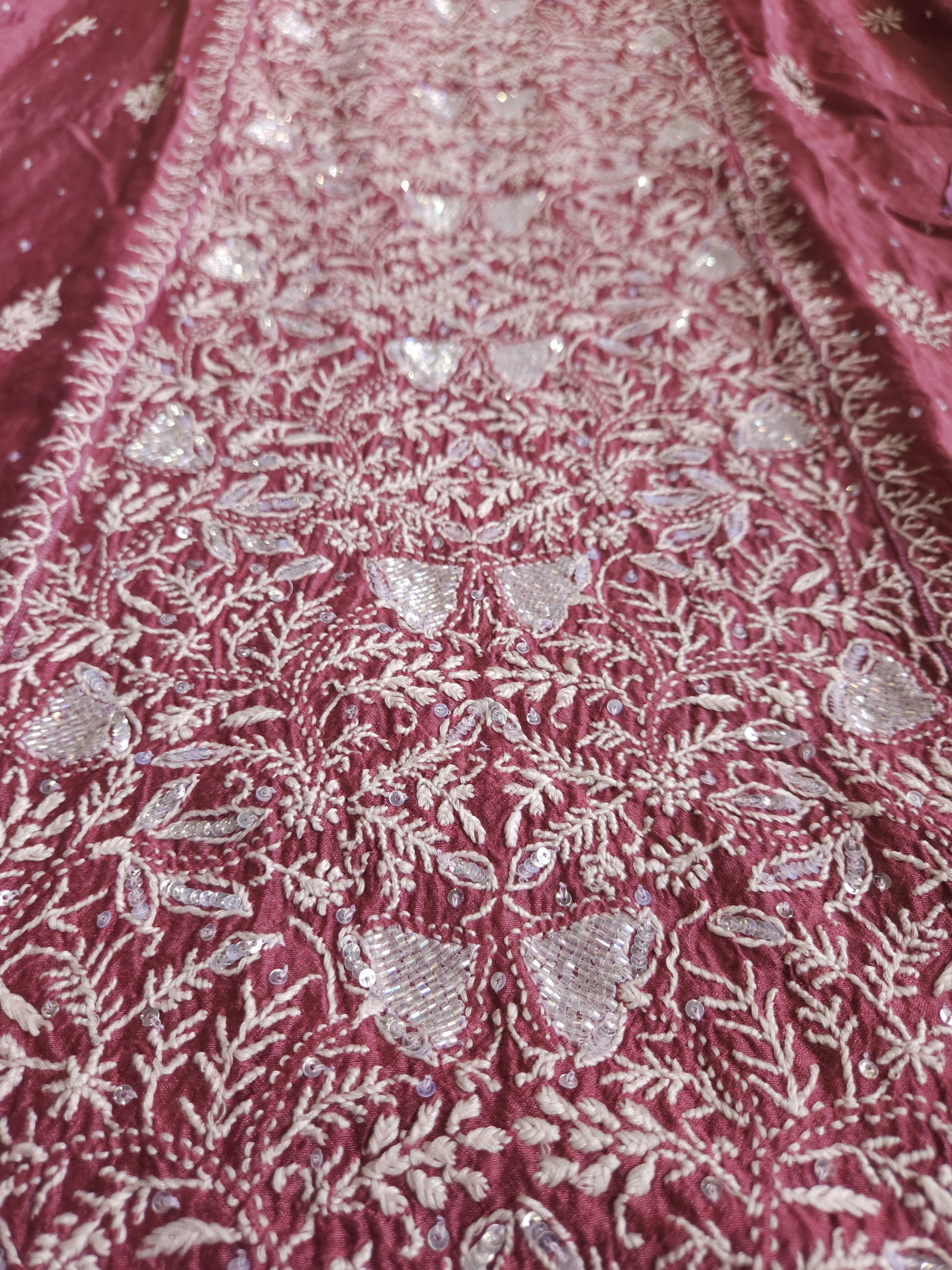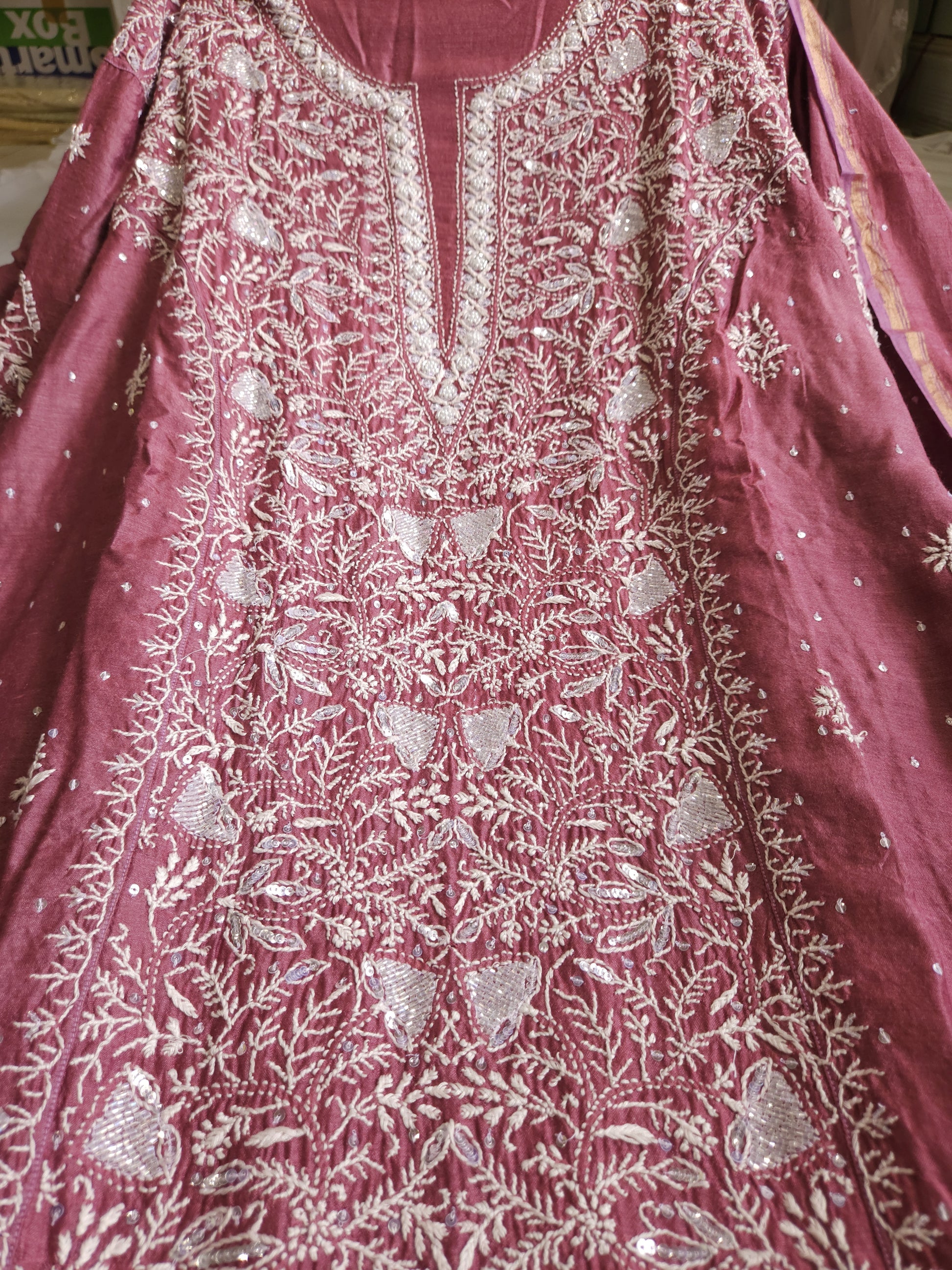 Authentic Luckhnowi Handwork Chikankari; with Full Jaal Work Kurta; with Embellishment of Pearls, Katdana, Sequins and Border Bootie Silk Dupatta; with Border Bootie Sleeves.