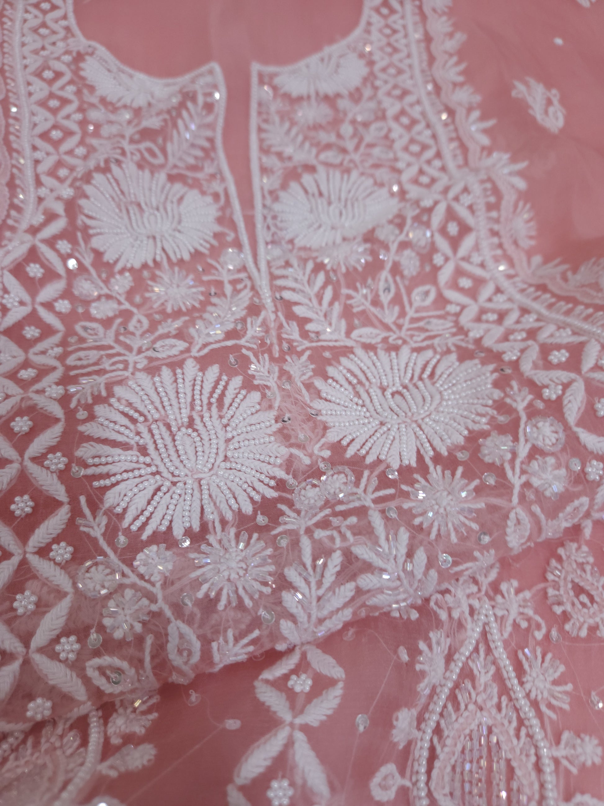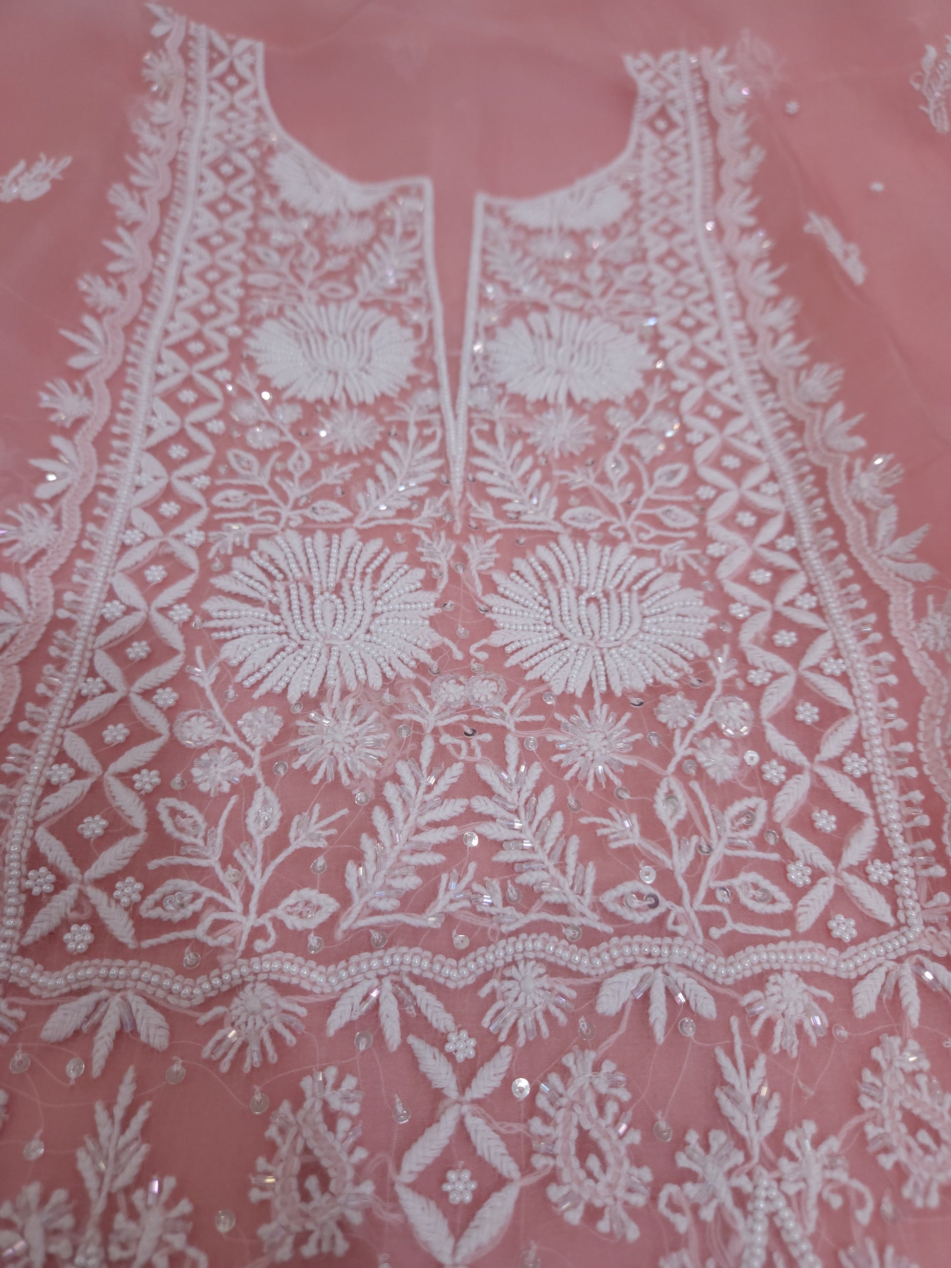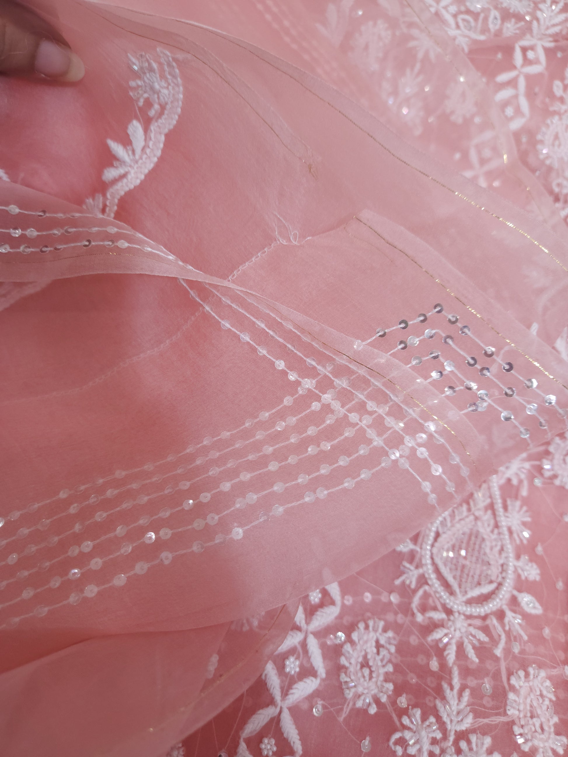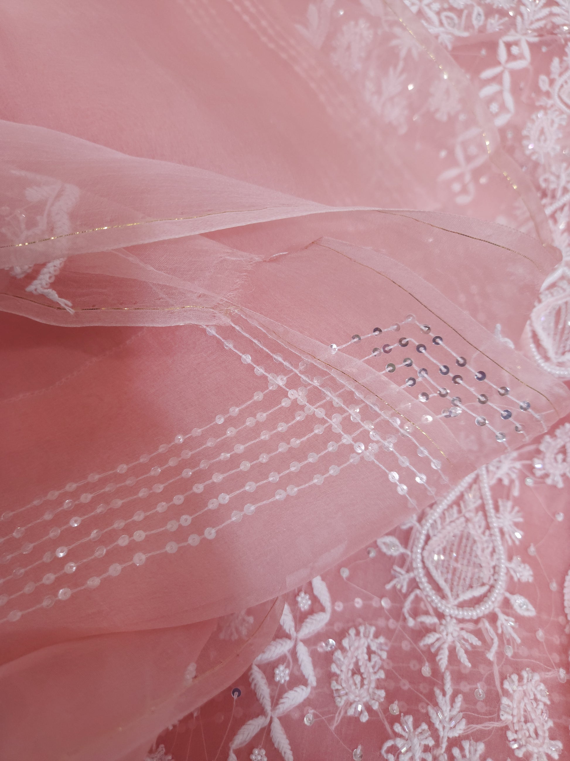 Authentic Luckhnowi Handwork Chikankari; with Heavy Embellishments of Pearls, Katdana, Sequins; with Two Side Border Bootie Dupatta.