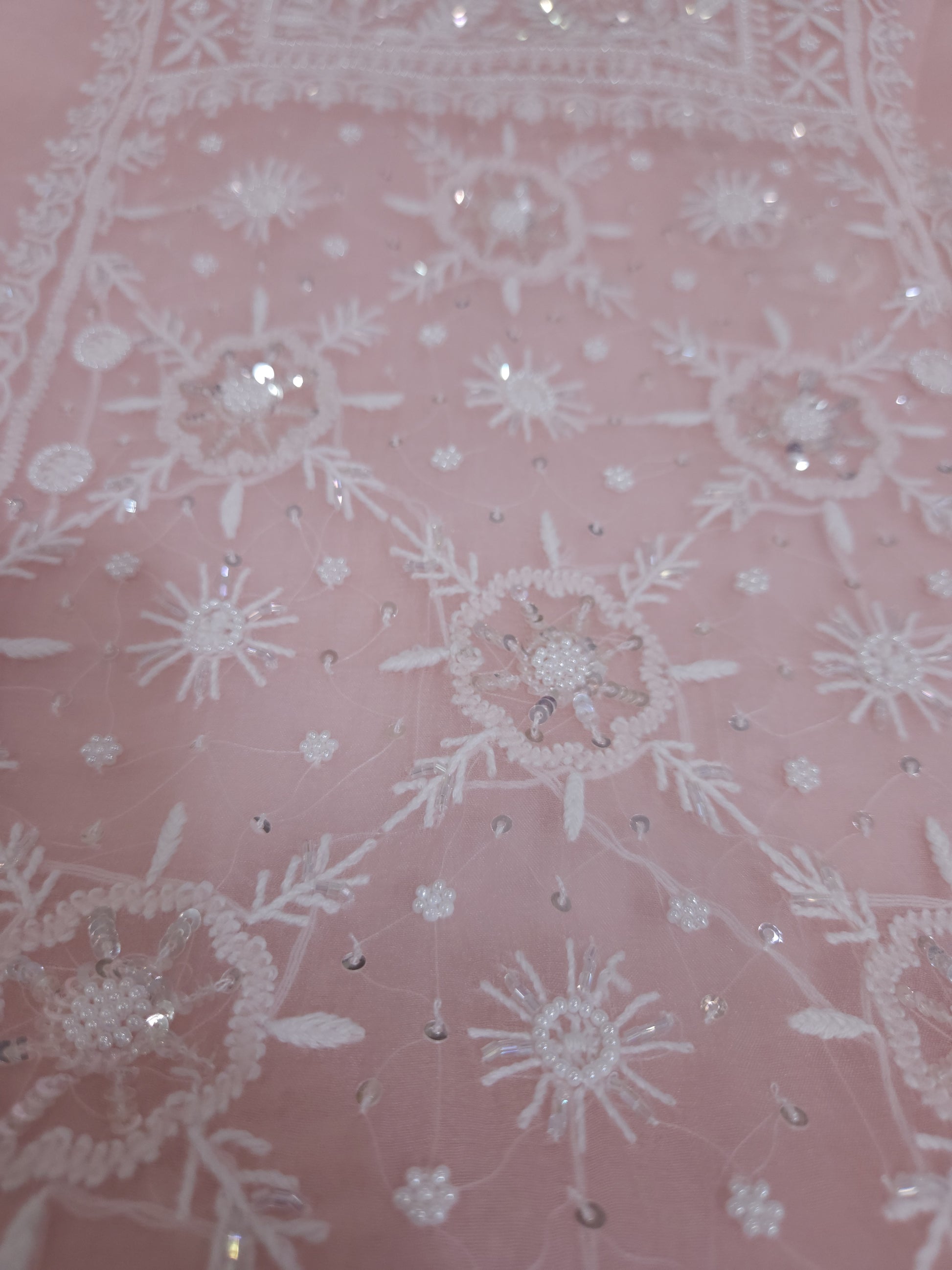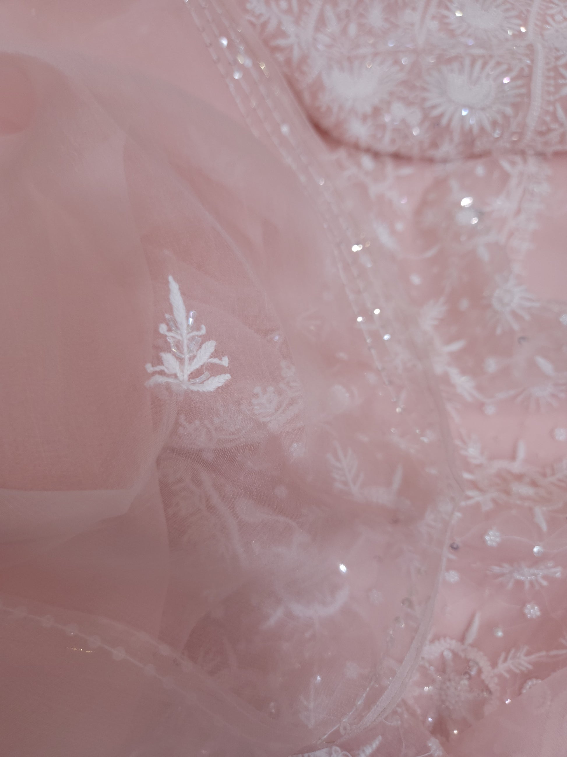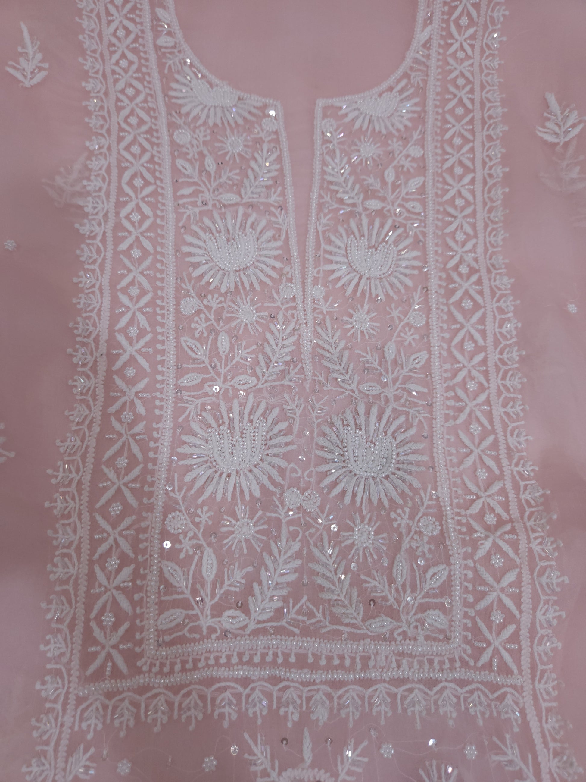 Authentic Luckhnowi Handwork Chikankari; with Heavy Embellishments of Pearls, Katdana, Sequins; with Two Side Border Bootie Dupatta.
