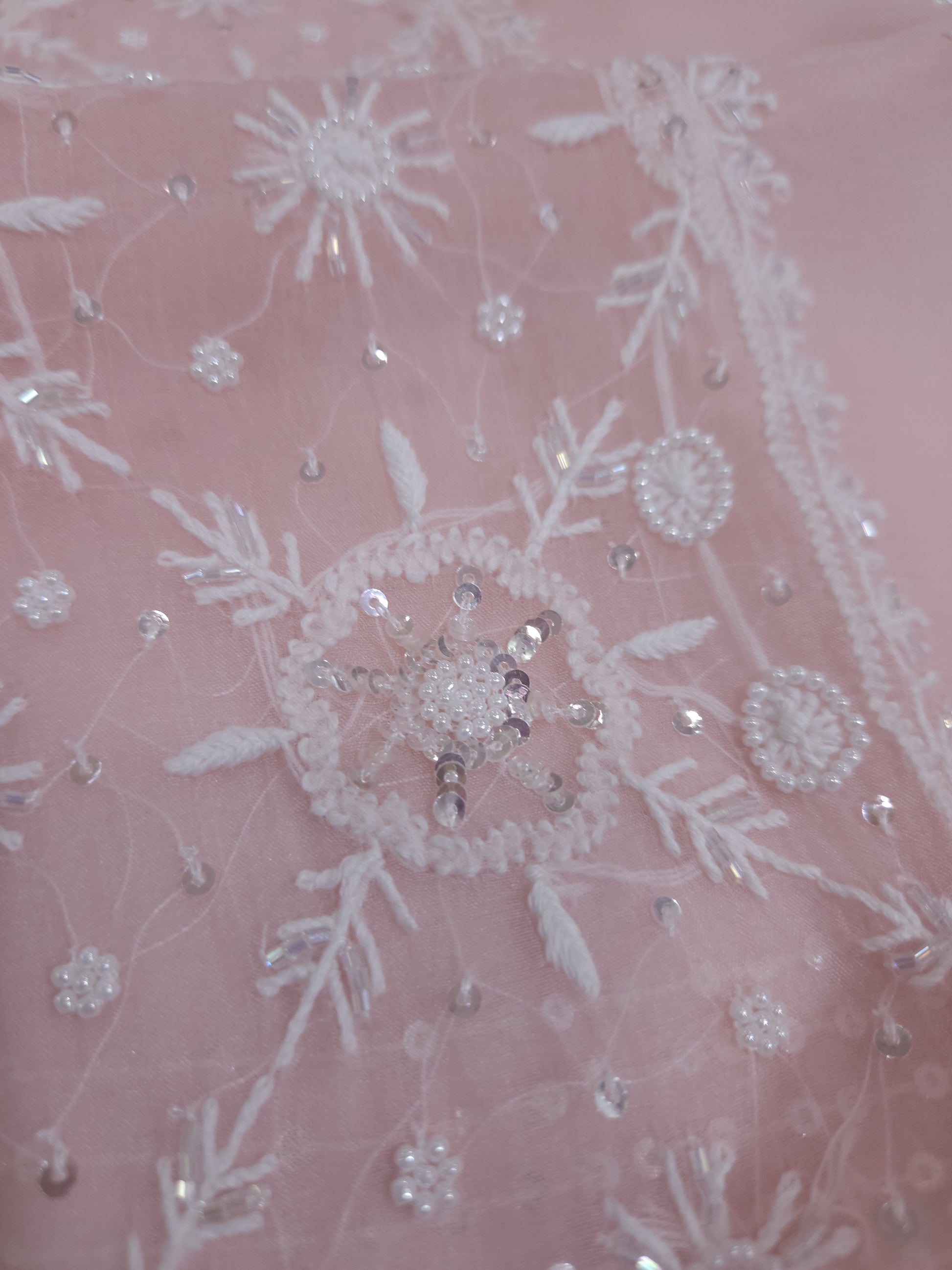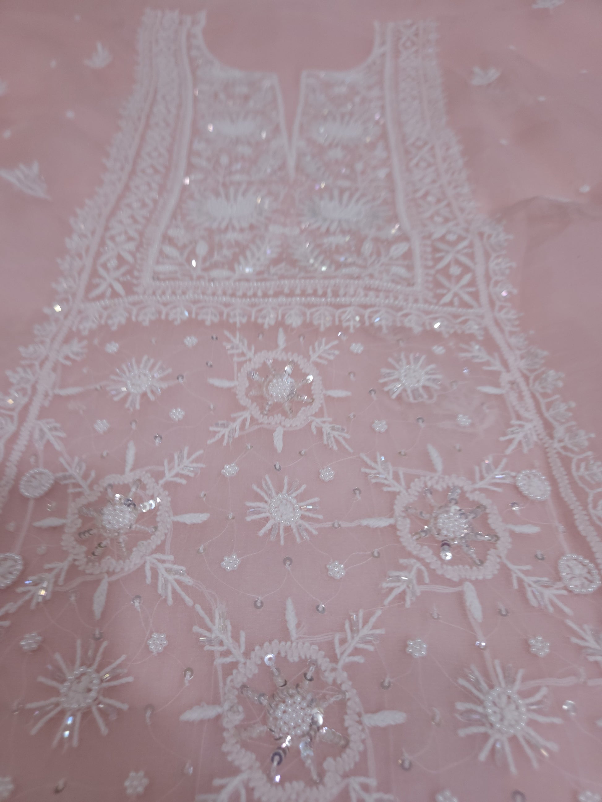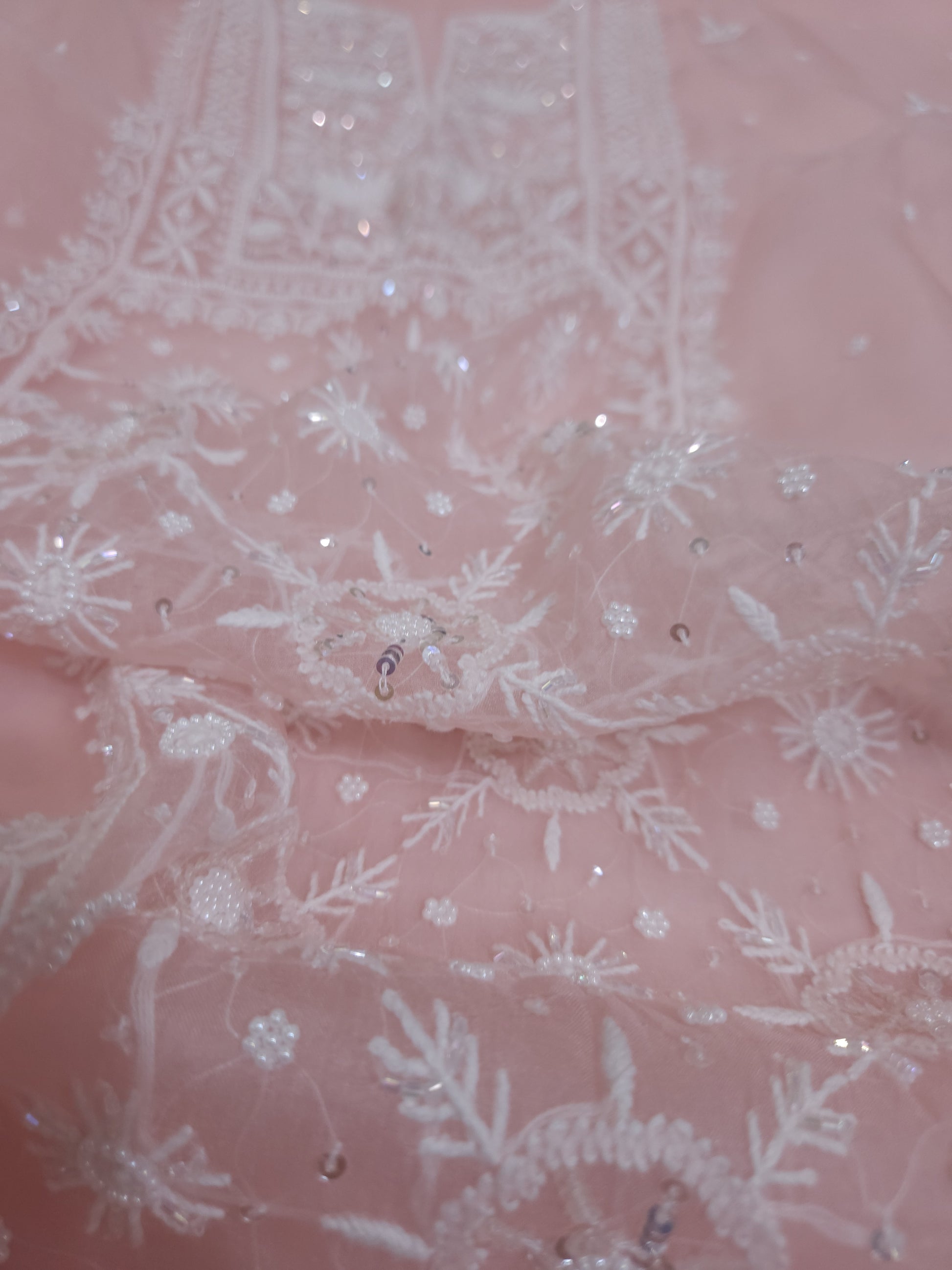 Authentic Luckhnowi Handwork Chikankari; with Heavy Embellishments of Pearls, Katdana, Sequins; with Two Side Border Bootie Dupatta.