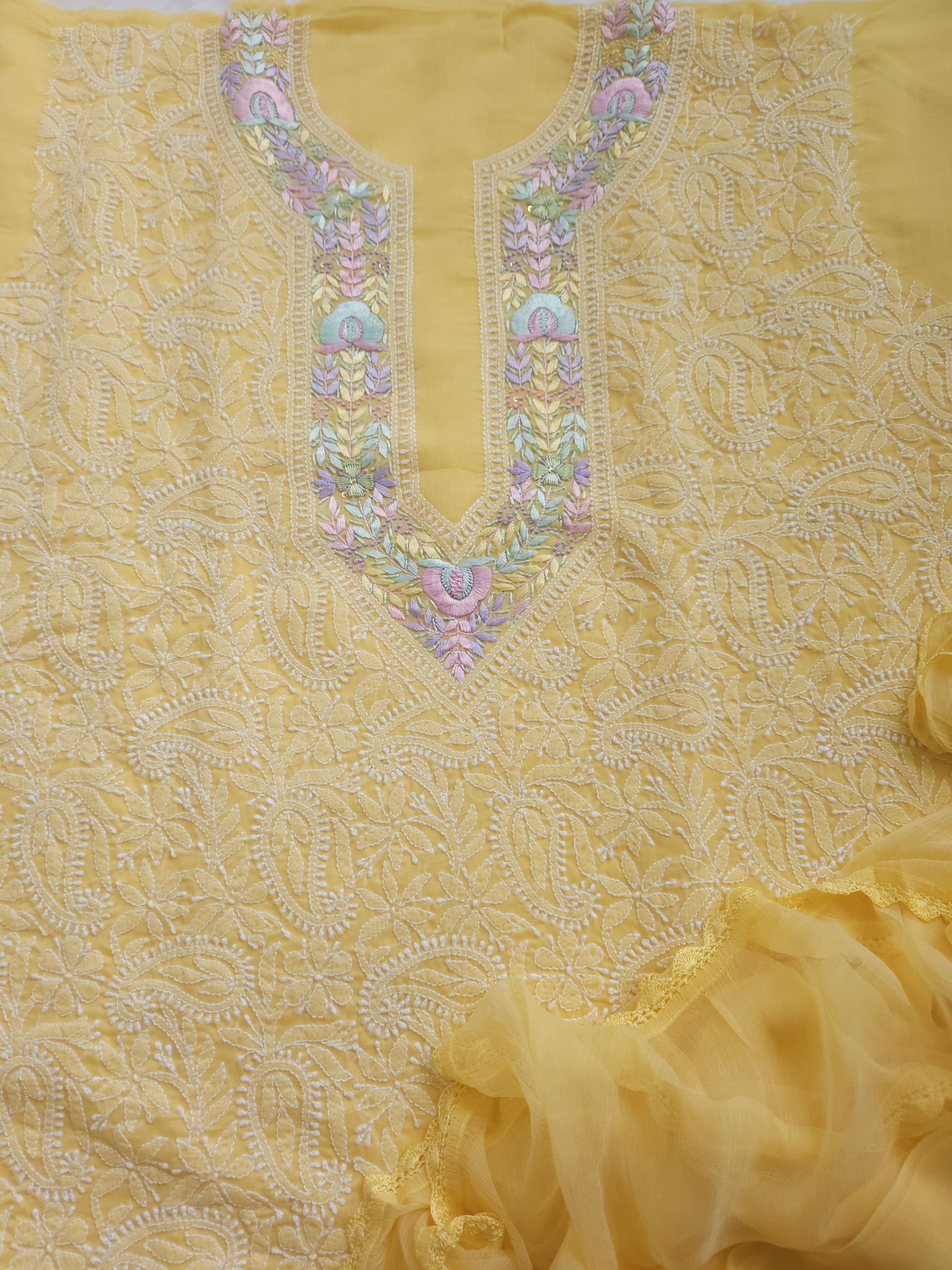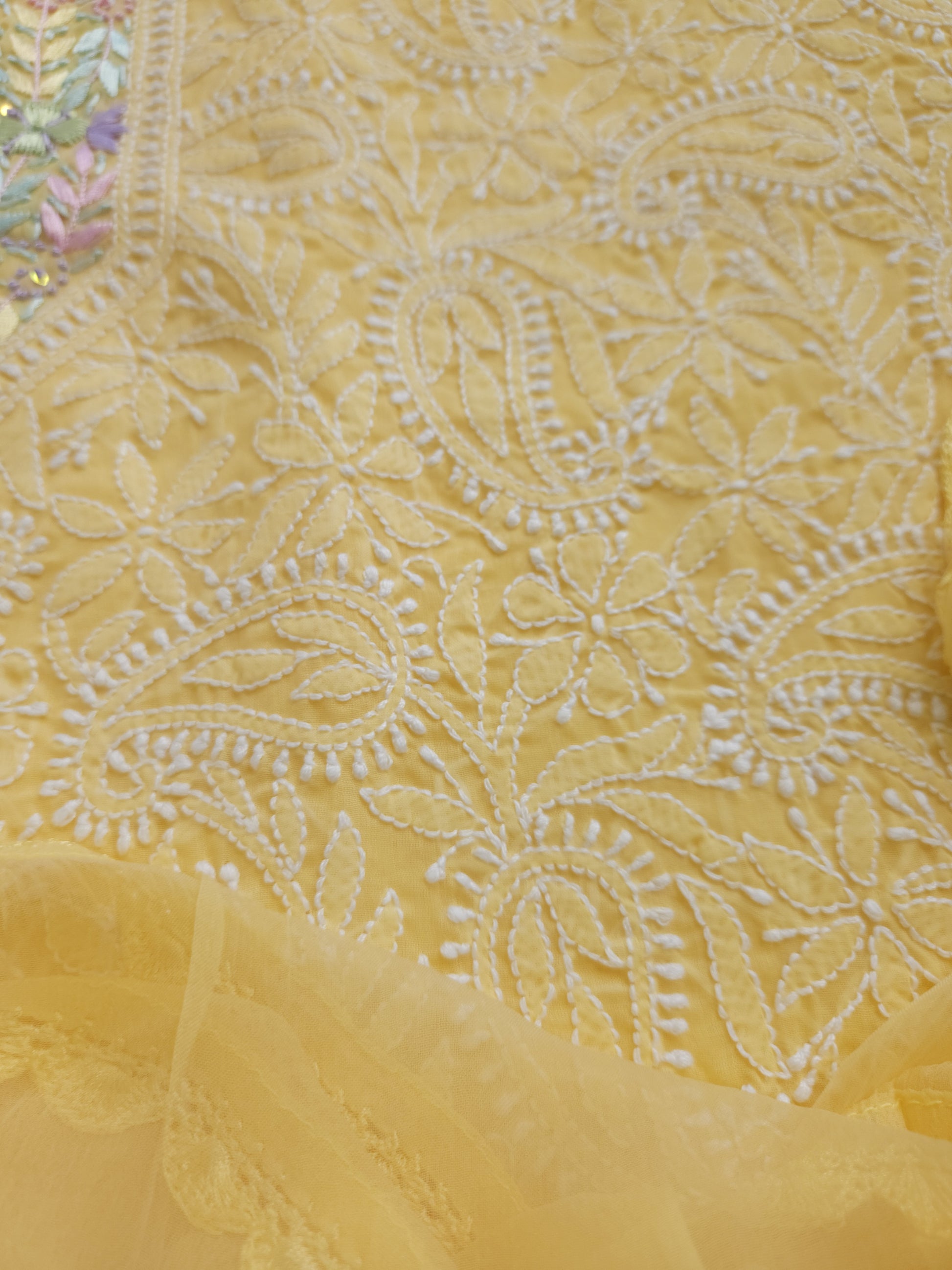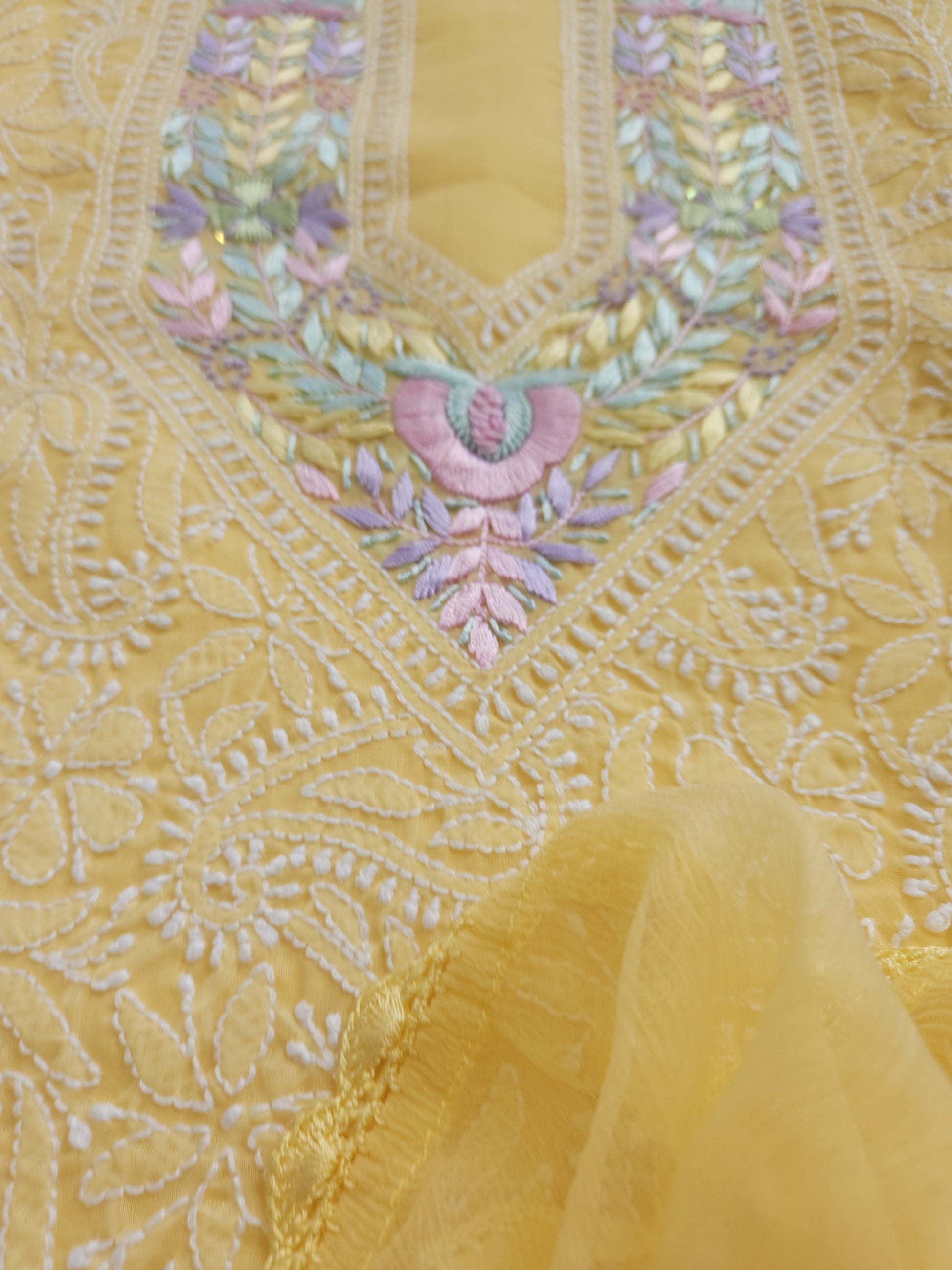Authentic Lucknowi Handwork Chikankari, Front Full Jaal Kurta with Resham Thread Parsi work on Neckline, with Border Bootie Work on Sleeves and Salwar, with Chiffon Dupatta.