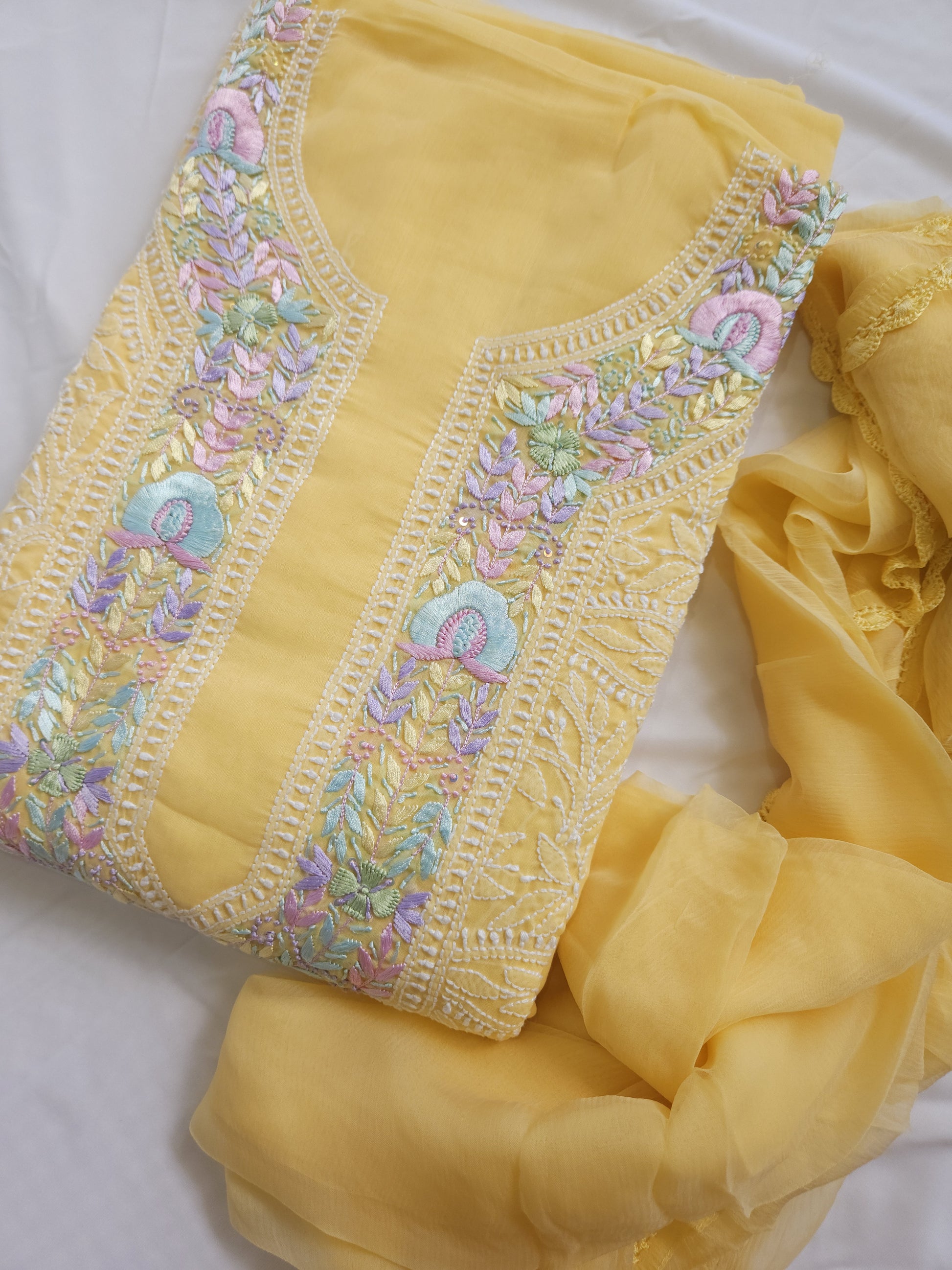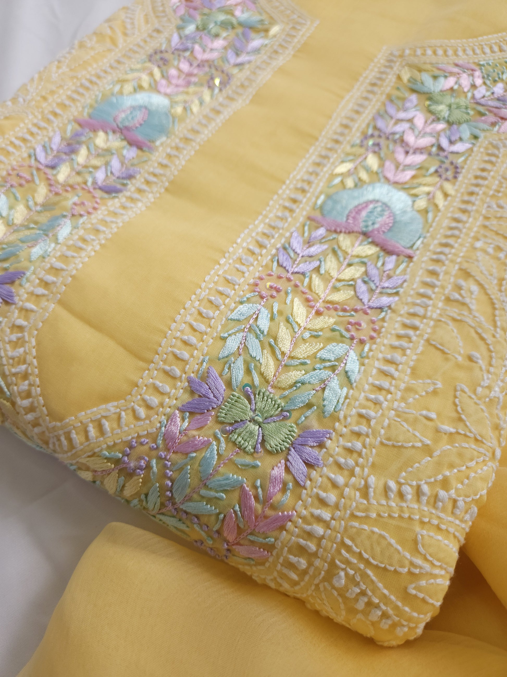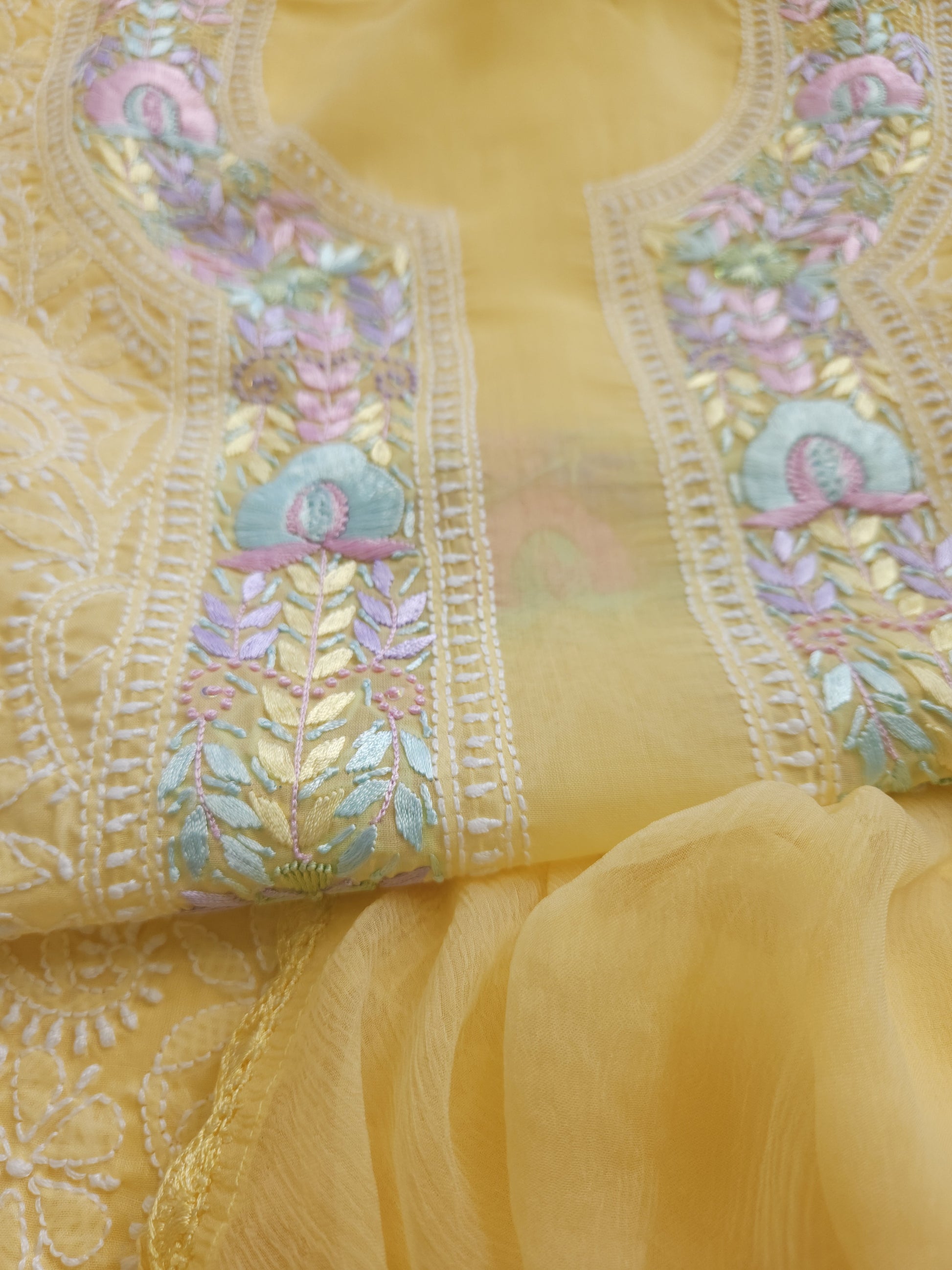 Authentic Lucknowi Handwork Chikankari, Front Full Jaal Kurta with Resham Thread Parsi work on Neckline, with Border Bootie Work on Sleeves and Salwar, with Chiffon Dupatta.