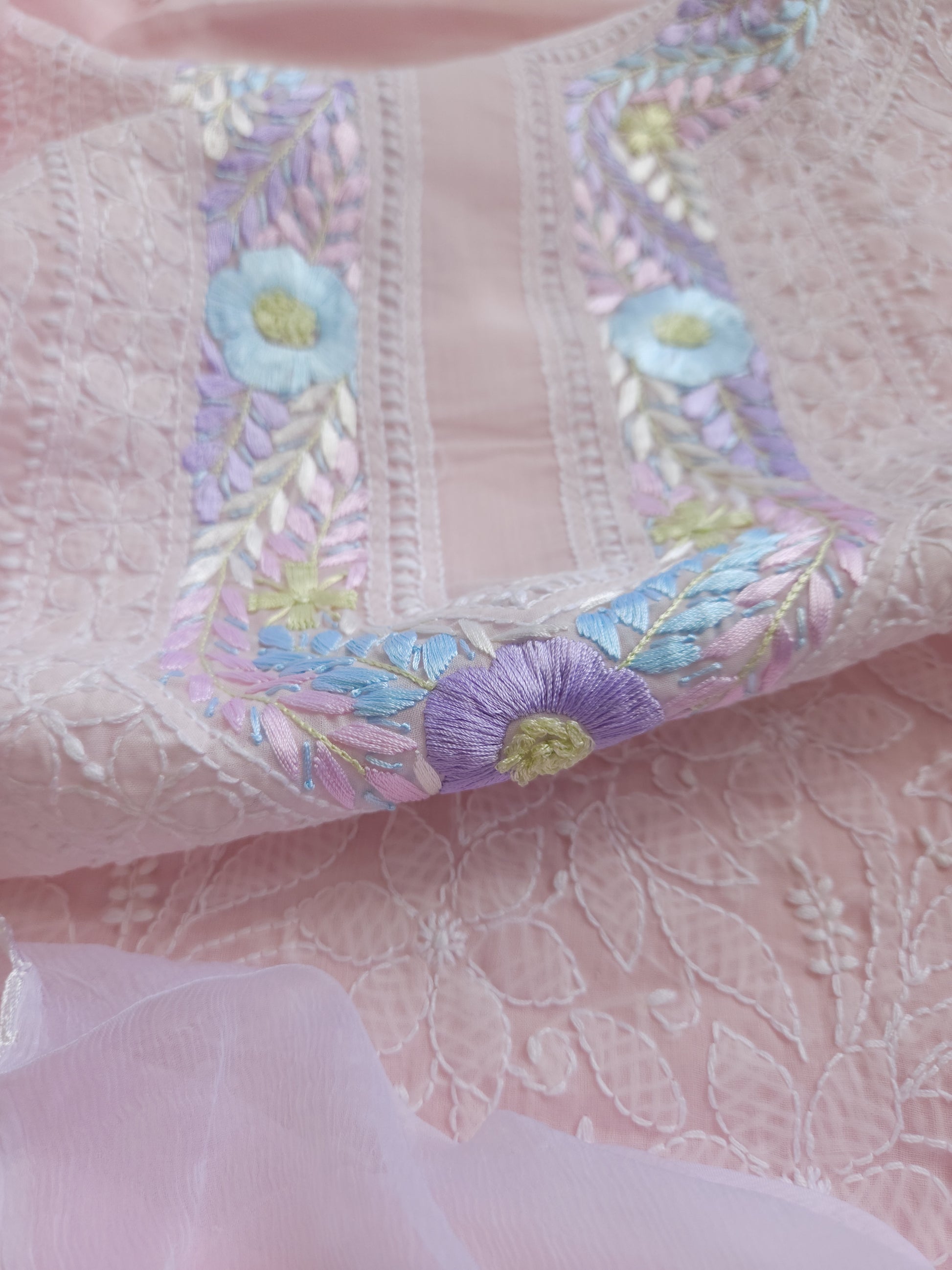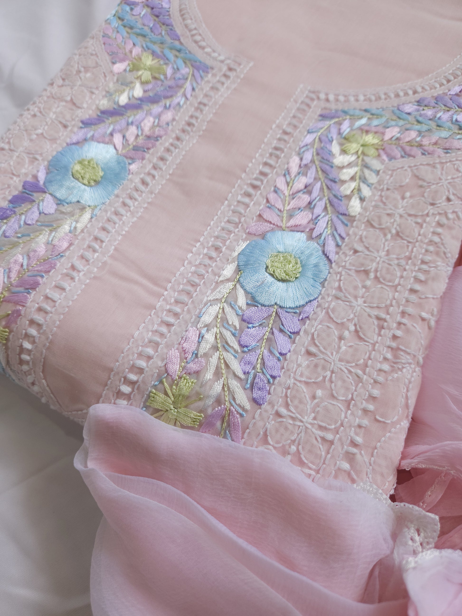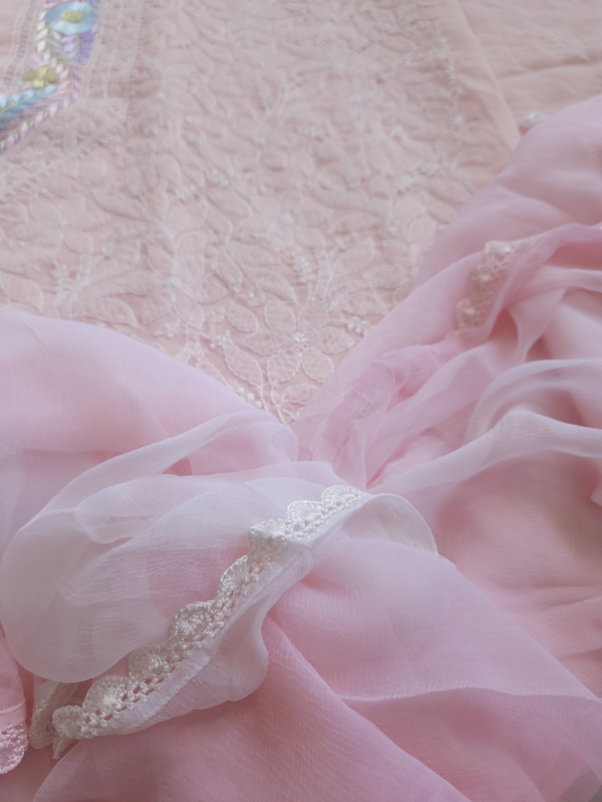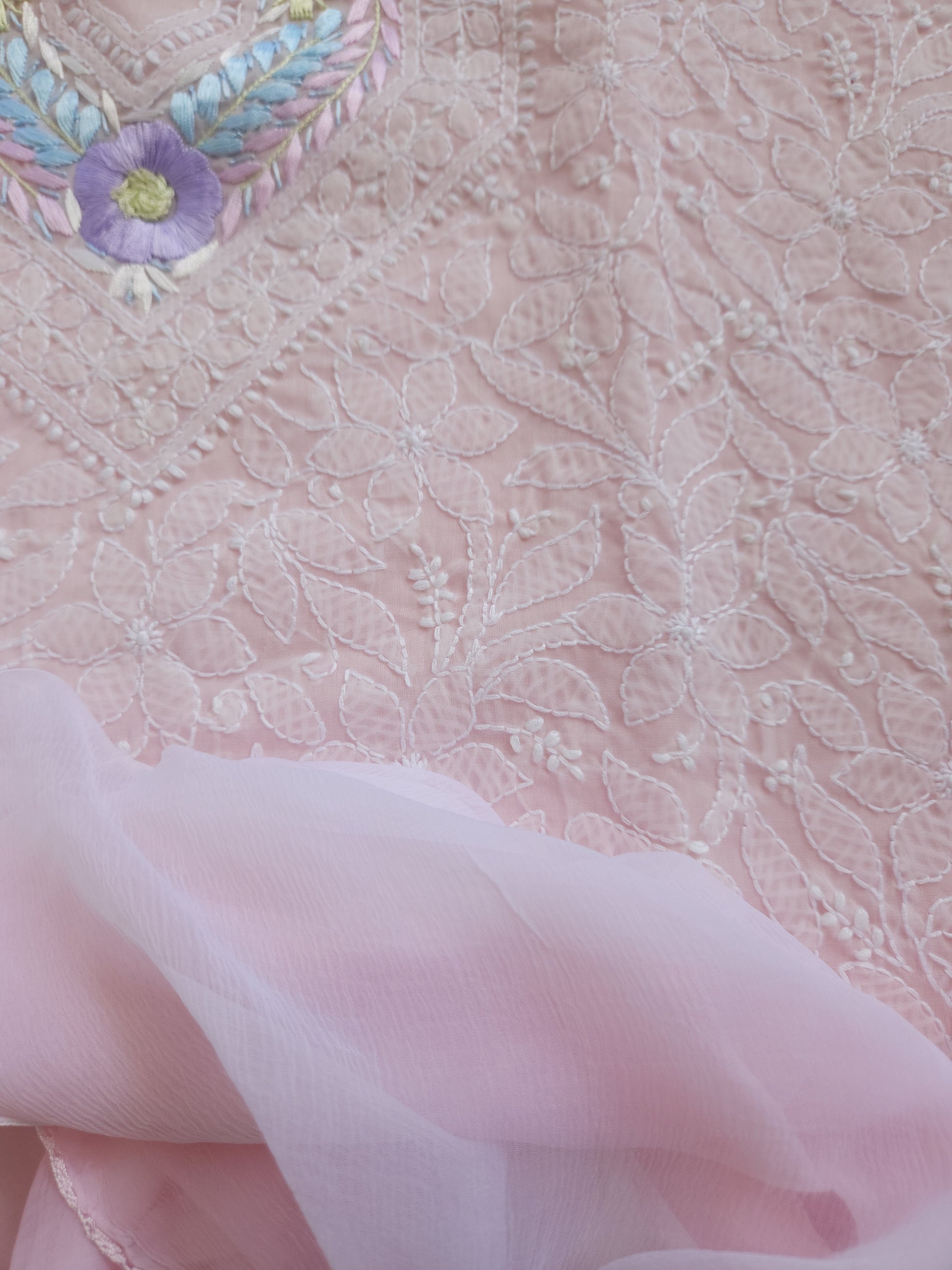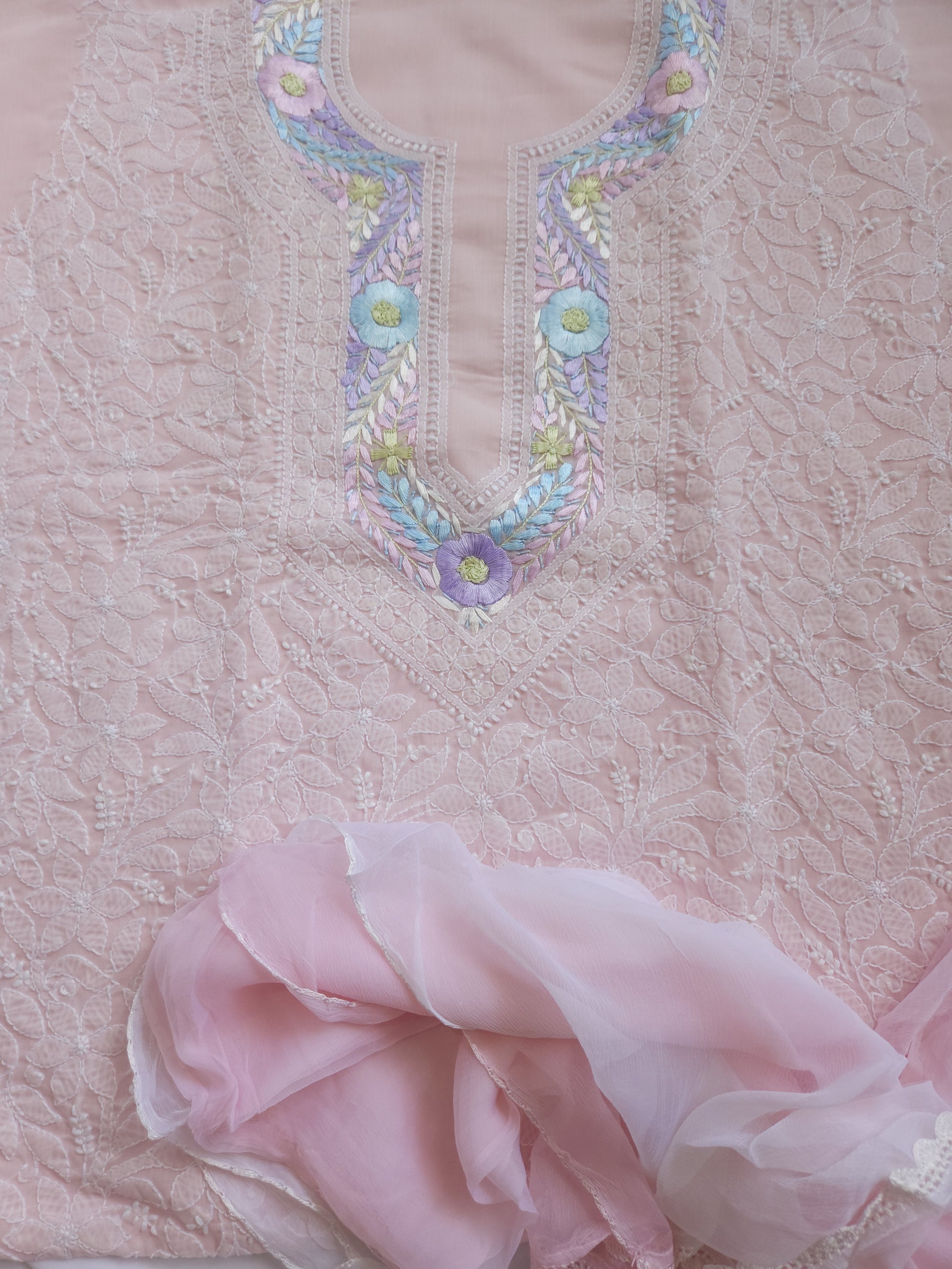 Authentic Lucknowi Handwork Chikankari, Front Full Jaal Kurta with Resham Thread Parsi work on Neckline, with Border Bootie Work on Sleeves and Salwar, with Chiffon Dupatta.